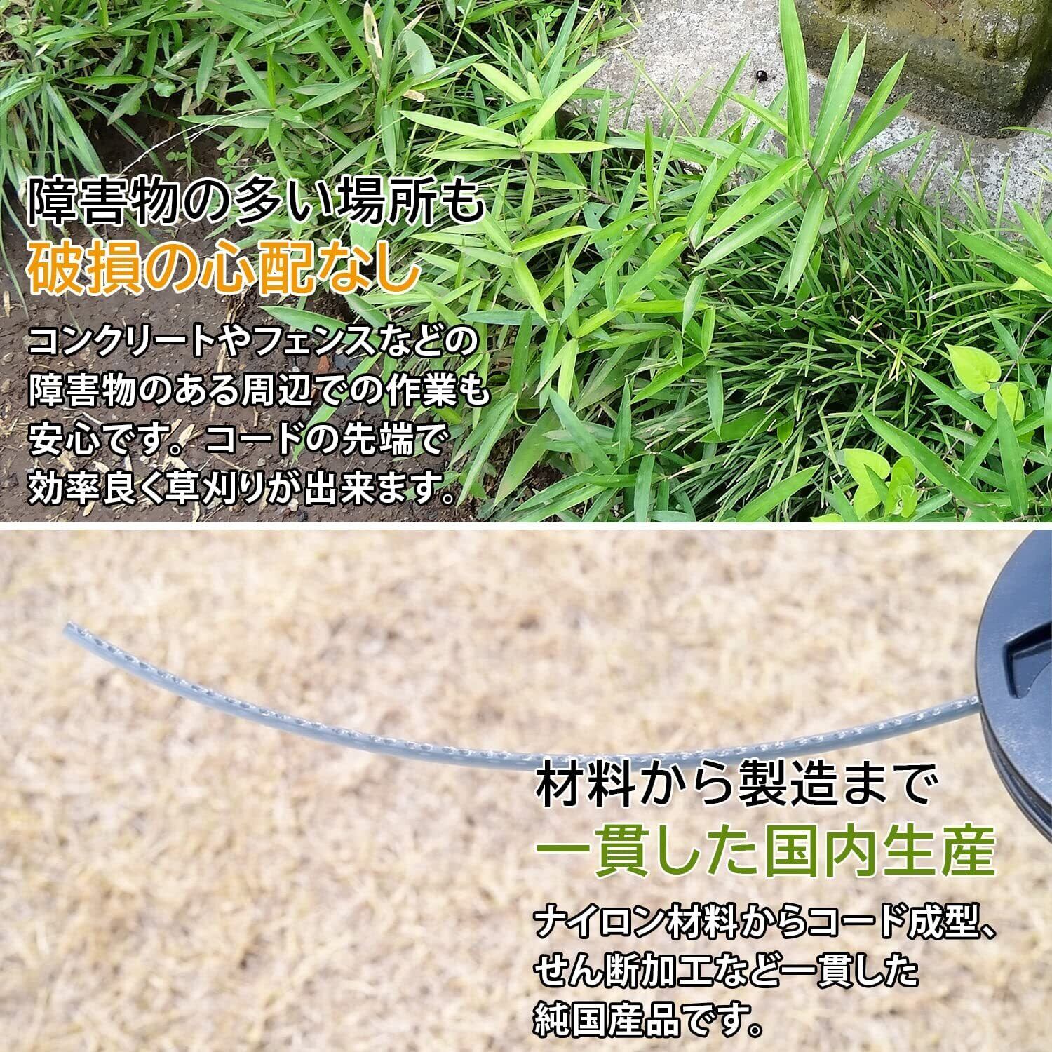 【特徴】切れ味抜群な草刈用ナイロンコードです。ナイロン材料・コード成型・せん断加工などすべて日本国内で行っております。キックバックが起きにくいナイロンコードは安全性が高く、さらに草を粉砕しながら刈り取りを行うので、草刈作業後の草を集める作業を必要としません。刈り取った場所に草が溜まらなければ、刈り具合も確認できるので刈残しも少なく済みます。柔軟性に優れて、カッターヘッドへの巻き作業も簡単です。のこぎり状の刃形状は切れ味抜群で、初秋の硬くなりやすい草でも高い切れ味を発揮します。