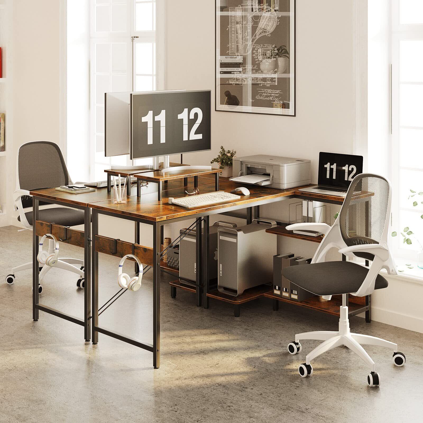 【ラック付きl字デスク】デスクの足元には一体型のラックが備え、本や書類などを使いたい時にサッと取り出せます。たっぷりの収納でデスク周りをスッキリ快適に!また、L字型のデザインで部屋のコーナーを最大限に活用し、ご家庭でもオフィスでも、日常の操作に十分なスペースを確保できます。