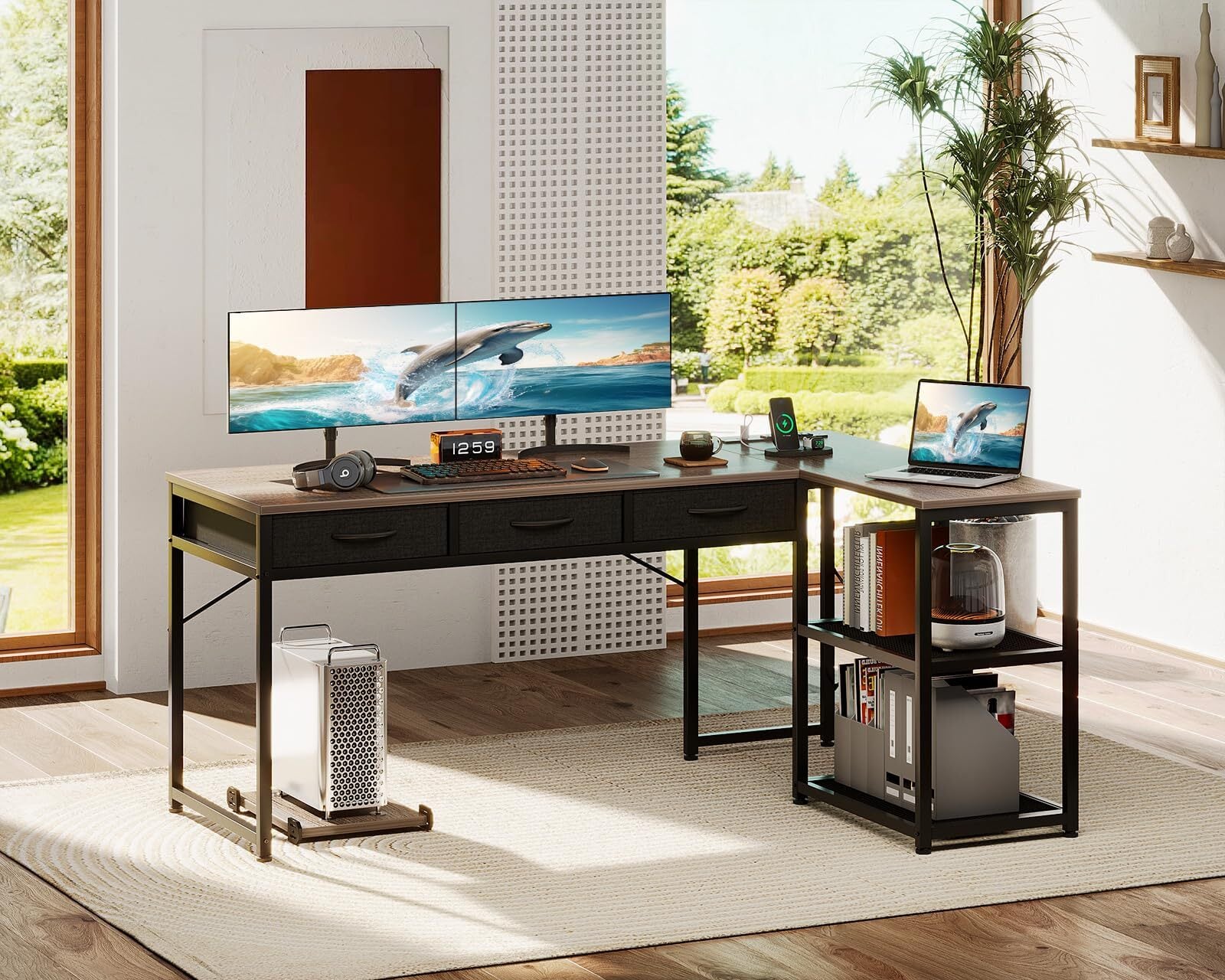 【引き出し3杯付きl字デスク・収納力満載】デスクの下には一体型の引き出しとラックが備え、本や書類などを使いたい時にサッと取り出せます。たっぷりの収納でデスク周りをスッキリ快適に!また、L字型のデザインで部屋のコーナーを最大限に活用でき、ご家庭でもオフィスでも、日常の仕事に十分なスペースを確保できます。