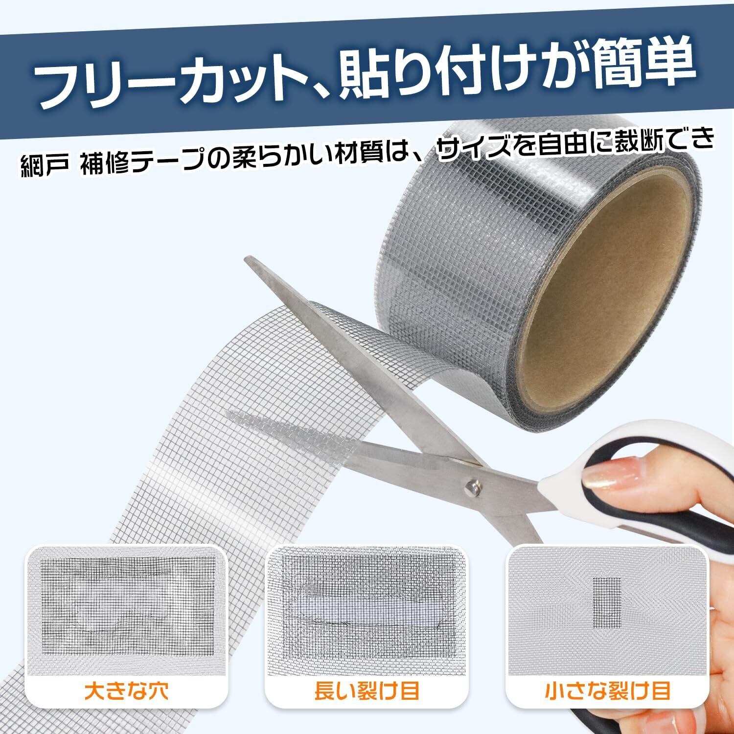 【簡単・便利な網戸補修テープ】[網戸補修テープ]は、網戸の穴や破れを手軽に修復するための強力なシールです。幅5cm、全長5mの大きさで、必要なサイズに自由裁断できるため、使い勝手も抜群です。