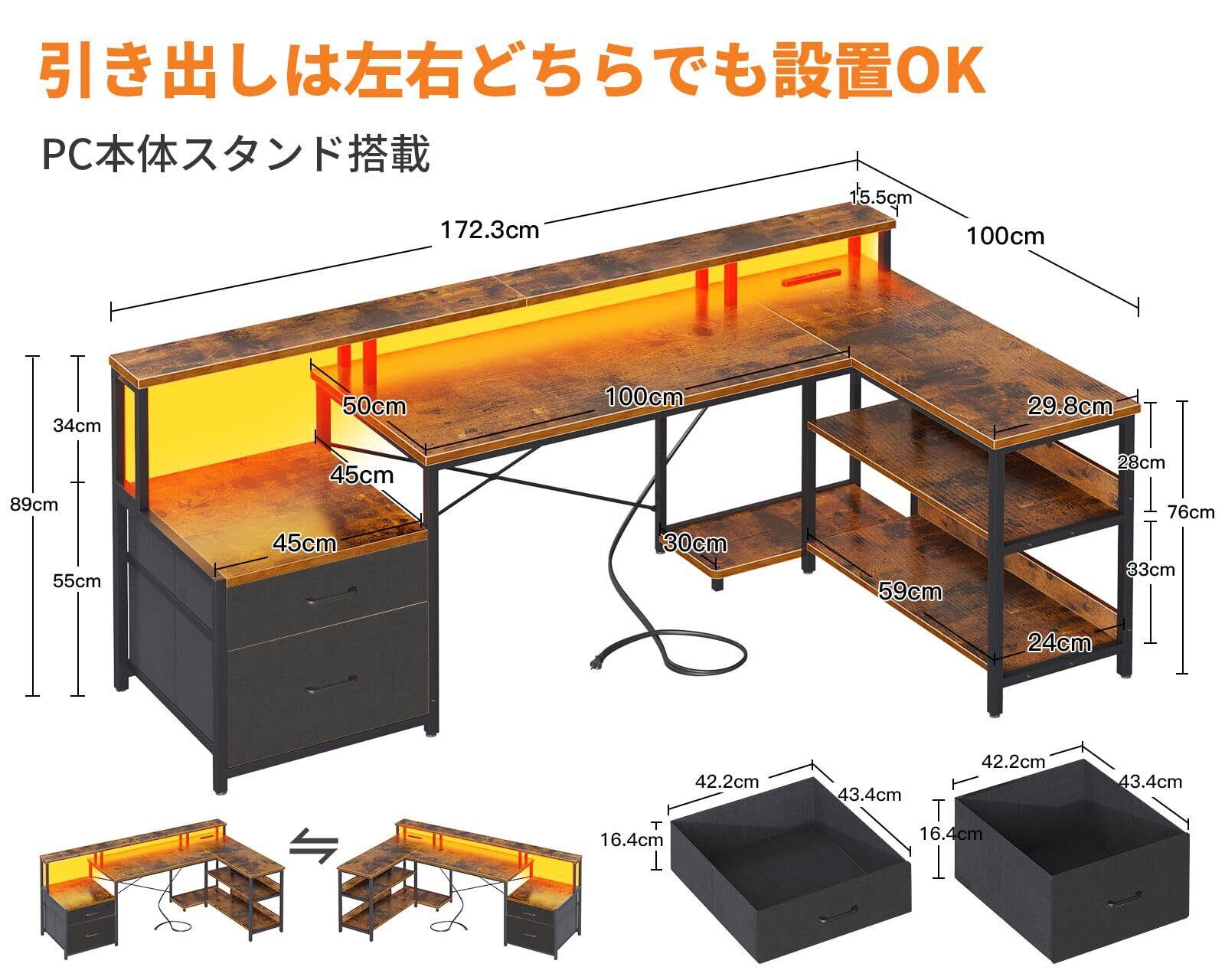[ODK] パソコンデスク 引き出し2杯付き ゲーミングデスク コンセント付き L字デスク 机 pcデスク 勉強机 棚付き オフィスデスク ワークデスク 幅172 事務机 在宅勤務 組立簡単 ビンテージ