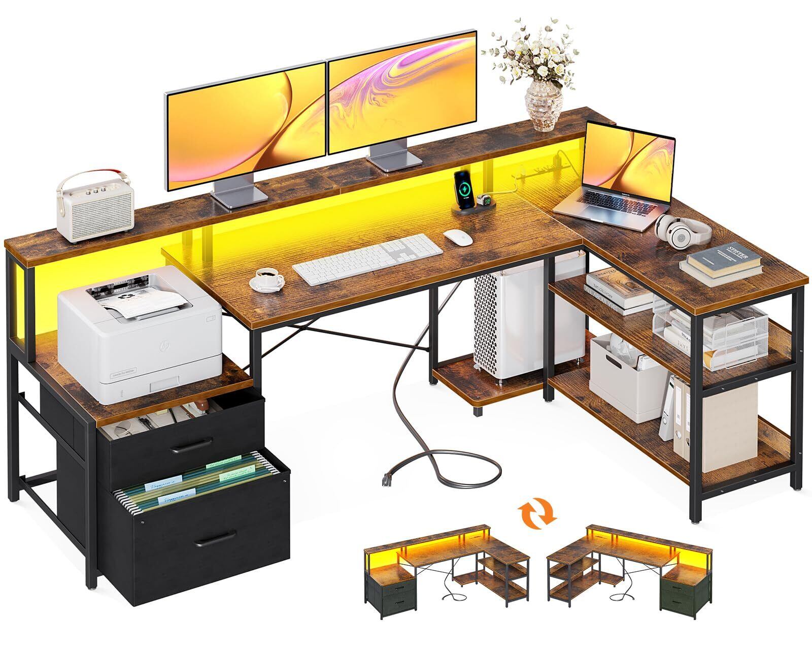 【コンセント付きデスク・ゲームと仕事両立】パソコンデスクとしてはもちろん、ゲーミングデスクとしても使用できるおしゃれなL字デスク。机には、2つのACコンセントとUSB ポート付きで、パソコンやスマホなどの充電ができて超便利です。また、引き出しとラックは間取りや利き手に合わせて左右付け替え可能。