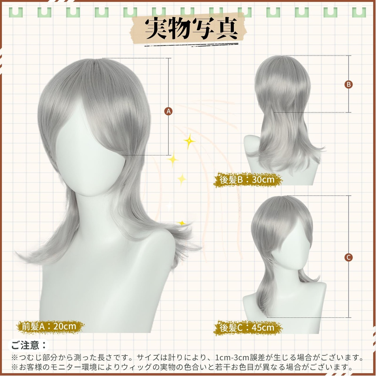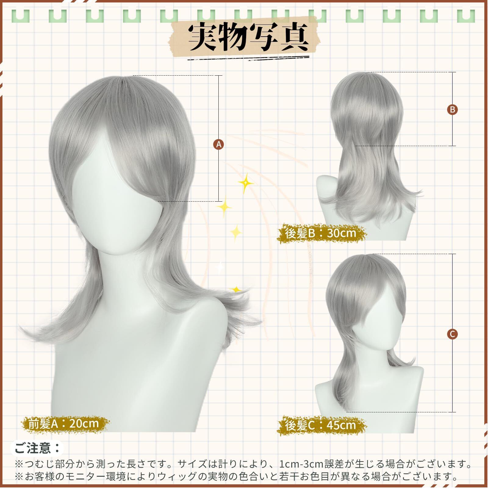 【商品説明】①前髪:約20cm;後髪(ウルフ部分を含まる):約45cm(つむじ部分から自然状態で測った長さです。サイズは計りにより、1cm-3cm誤差が生じる場合がございます。);②重さ:約130g;③頭周り:約55cm-58cm(フック式のアジャスター付き、頭周りにあわせて段階調節可能)。