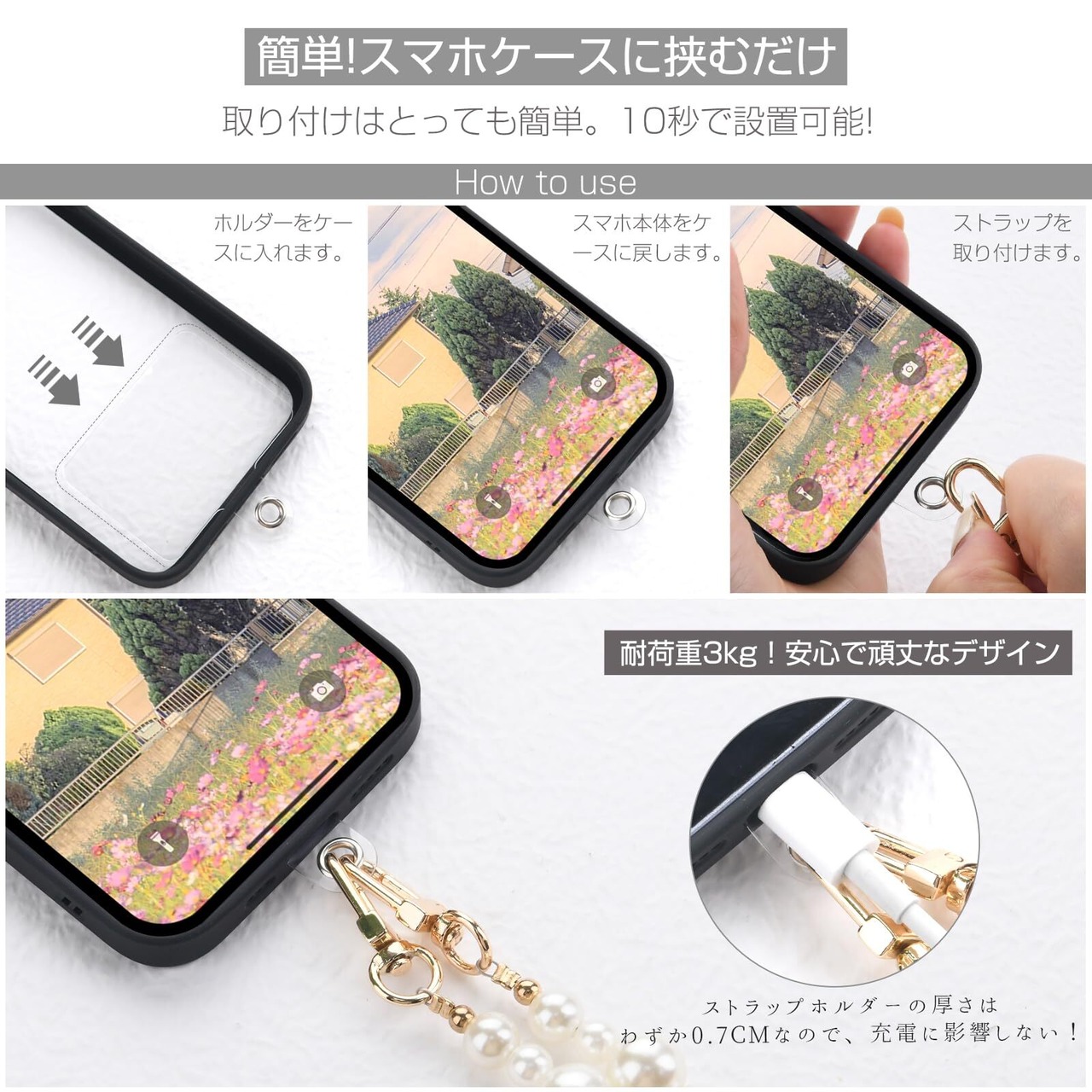 【高品質な素材と耐久性】パールチェーンを使用したこのストラップは、丈夫で長持ちします。日常使いでも安心してお使いいただけるよう、こだわりの素材を使用しています。旅行やアウトドア、カジュアルな日常使いにぴったりのアイテムです。