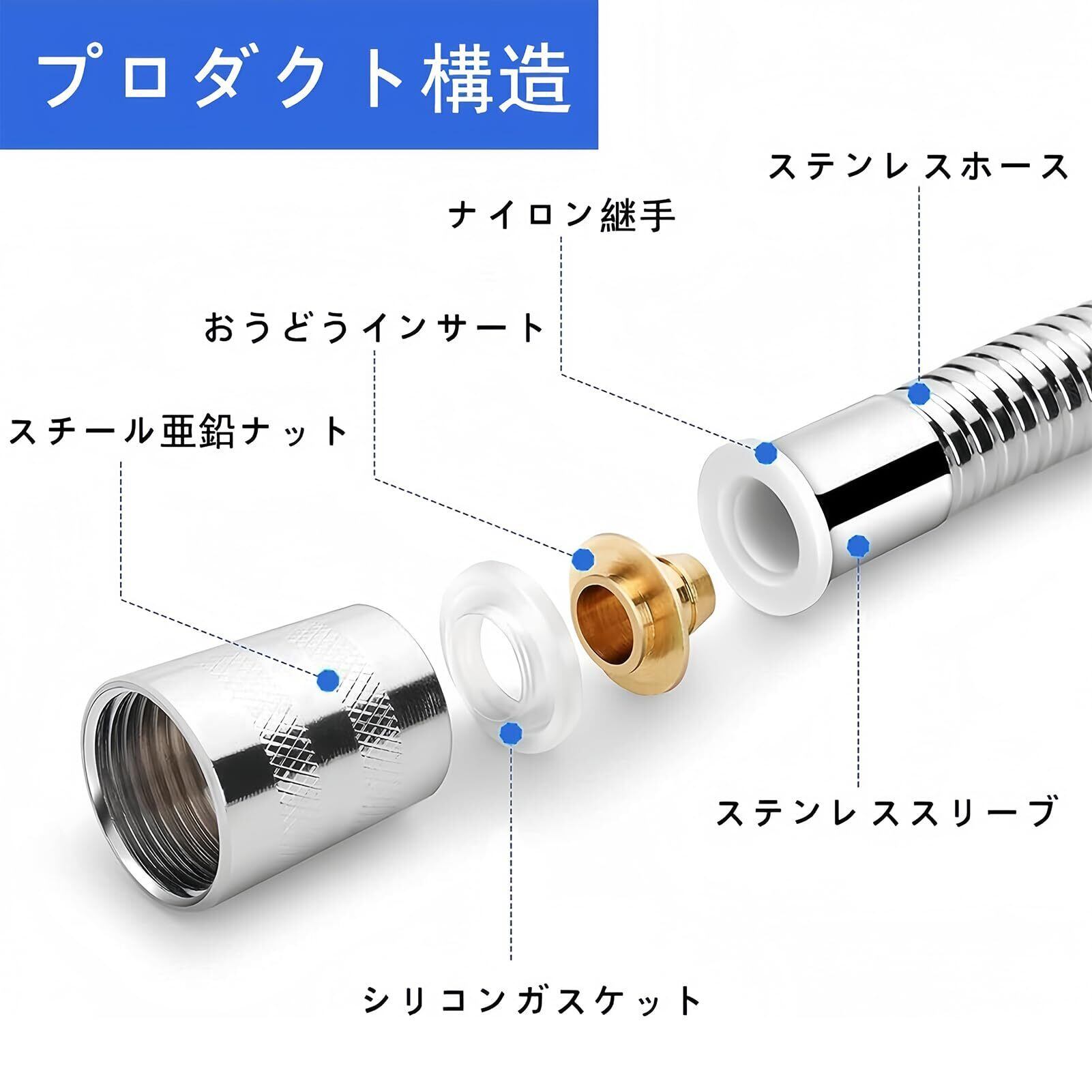 【耐久性抜群】シャワーホースの接続部はA級鍛造黄銅で精密加工されており、頑丈で耐久性に優れています。ネジサイズが国際標準G1/2(日本PJ1/2相当)で、接続が簡単です。ステンレス製外管とPVC内管の組合せにより、ホースは軽量と耐久性を両立させています。