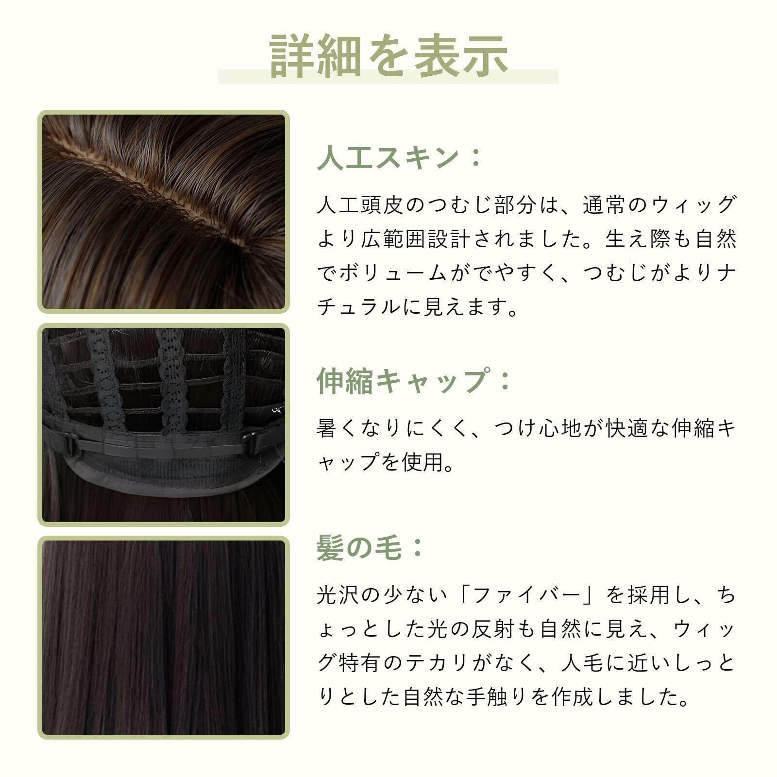 ポイント:デイリーウィッグとして開発され、とても軽くてしなやかです。ウィッグ特有の不自然なテカリも無く物凄く自然で、長時間着けていても頭が痛くならず付け心地も良いので、ウィッグで悩んでいるお客様は参考にしてみてくださいね。 ※ご注意:おでこの大きさは人によって異なりますが、前髪の部分は少し長めに作っていますので、自分に合った長さをカットしてください。毛量、毛丈は、商品ごとに若干のばらつきがあります。
