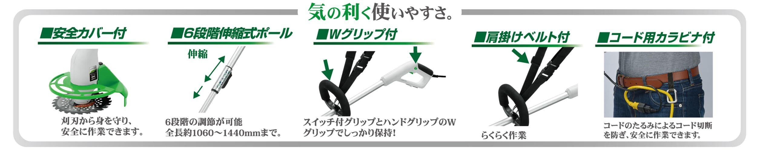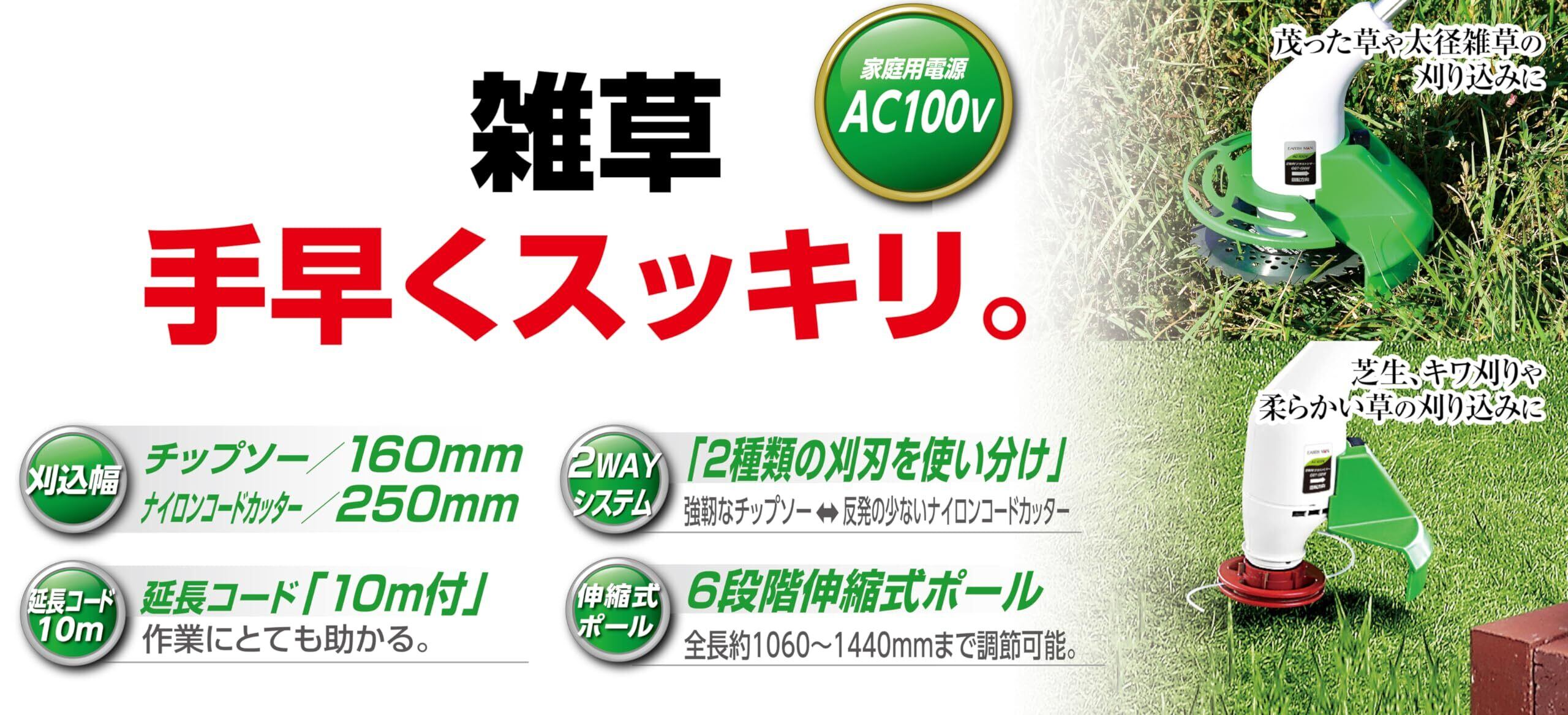 仕様/電圧:AC100V、周波数:50/60Hz、電流:2.6A、定格消費電力:250W、回転数:約6500min-1(チップソー)、約5500min-1(ナイロンコードカッター)、刈込幅:約160mm(チップソー)、約250mm(ナイロンコードカッター)、電源コード長:約0.4m、延長コード:約10m、定格時間:30分