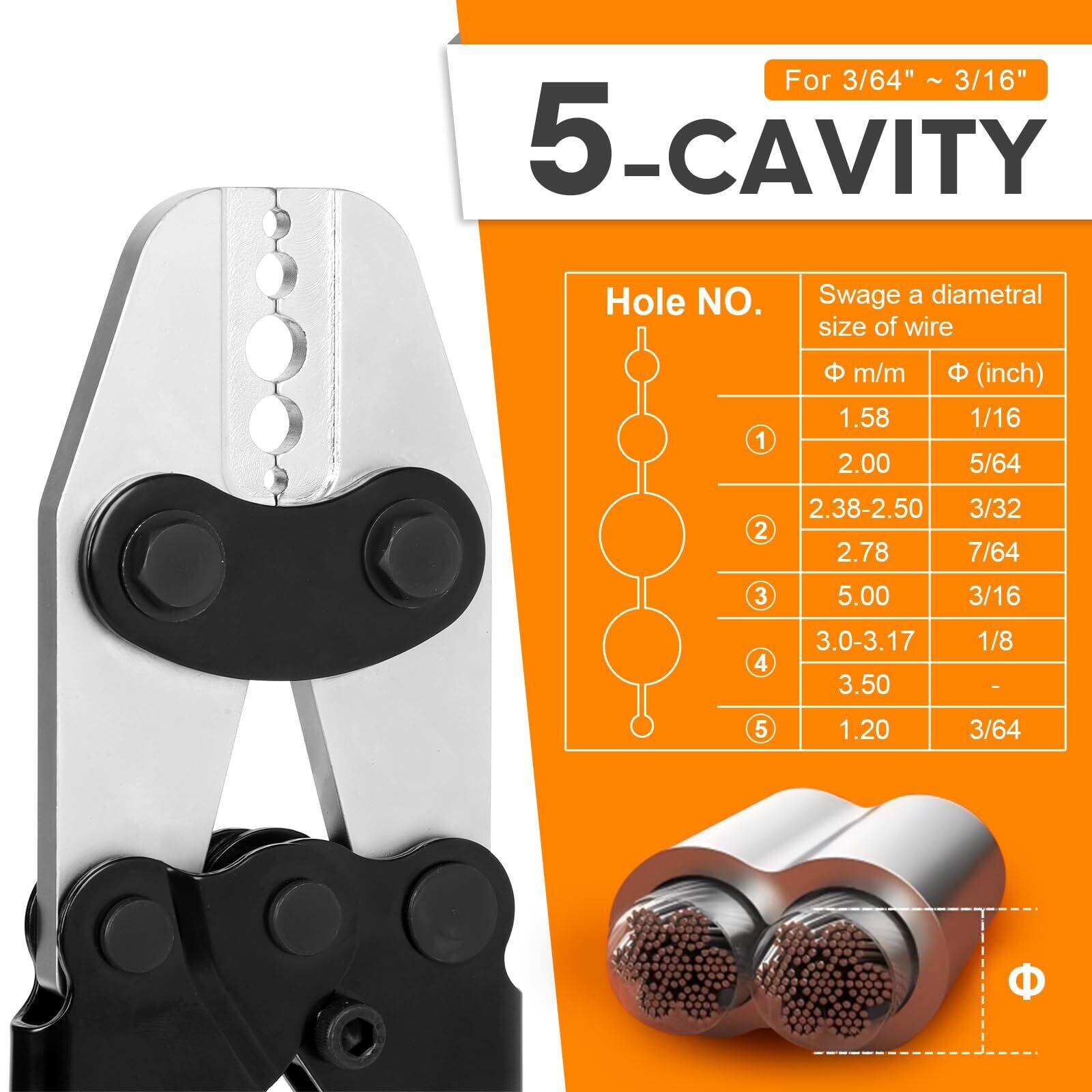 【3/64〜1/16インチのスリーブ対応】 5つの圧着サイズに対応しており、オーバル型・ダブルアルミスリーブ、アニール銅スリーブの圧着に最適です。