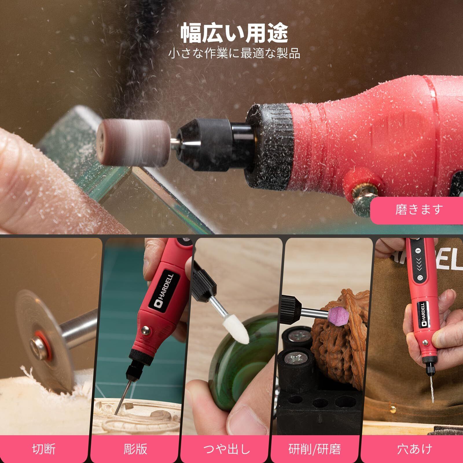 HARDELLミニルーター 5段変速 61PCS 18000RPM高速回転 USB充電式ミニ工具セット ルーターツール 電動 軽作業に適した 無線研磨/ポリッシュ/穴あけ/切断/除錆/彫刻/DIY/ネイルスタジオ 照明付き充電式ルーター 日本語取扱い説明書(ピンク)