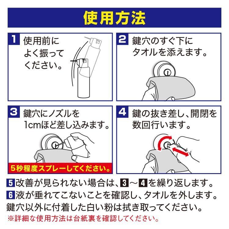鍵の中の汚れを溶かし吹き飛ばします。さらにボロンナイトライド配合で仕上げの潤滑で抜き差しが快適に。シリンダーキーにも、ディンプルキーも