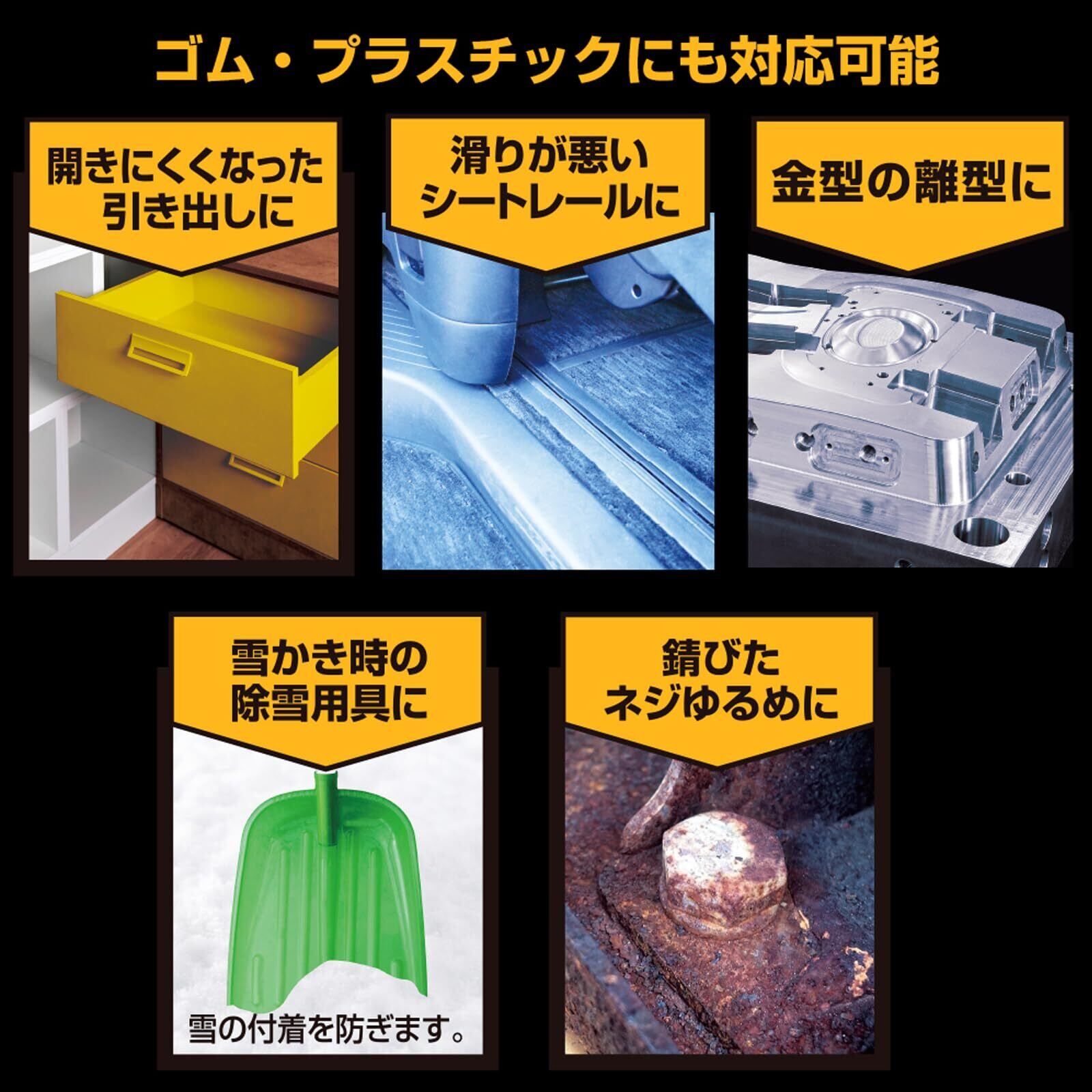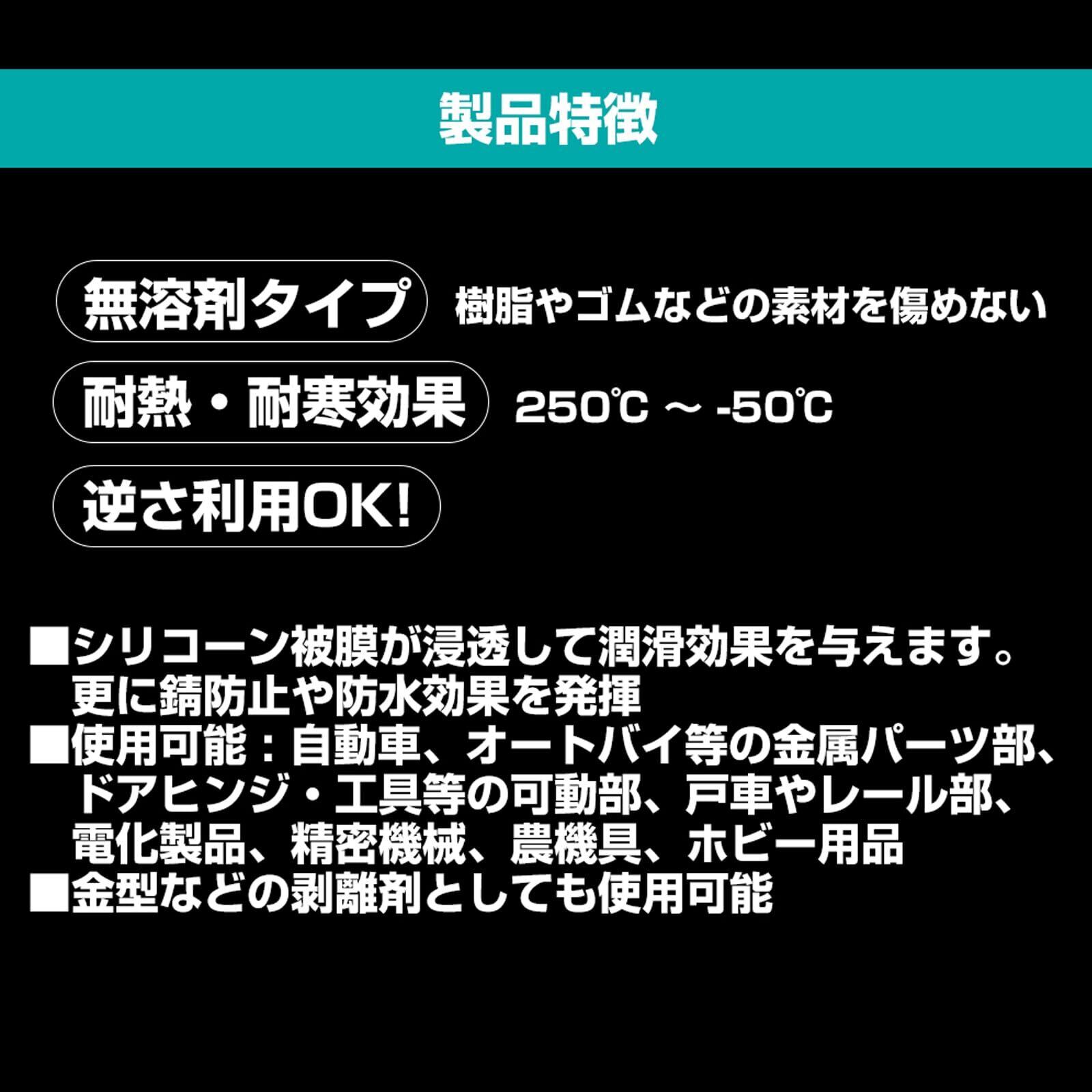 シリコーン被膜の優れた潤滑・防錆効果により、自動車・オートバイ等の金属パーツ部・ドアヒンジ・戸車・ベアリング等、各部に浸透して動きをスムーズにし、錆を防ぎます。