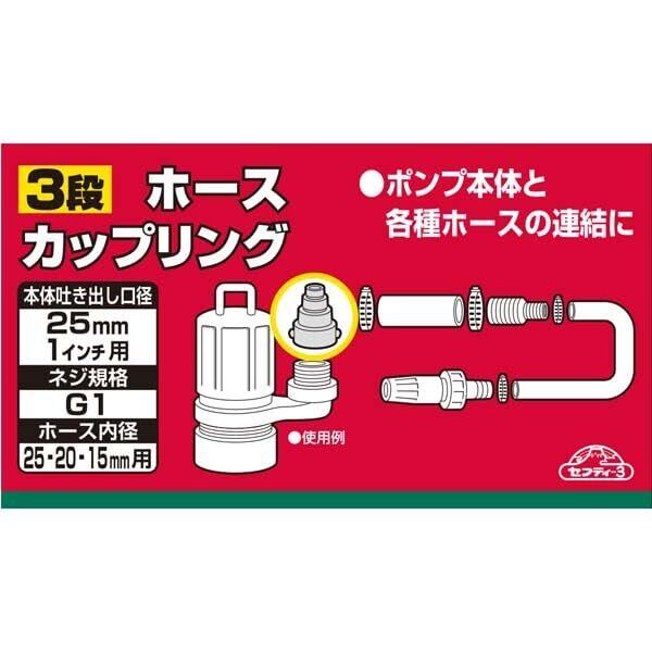 ポンプ本体と各種ホースの連結にメスネジ部はポンプ本体にタケノコ部はホースの接続にホースバンドを使用してホースに接続します25mm口径ポンプを25mm、20mm、15mmのホースへの接続が可能
