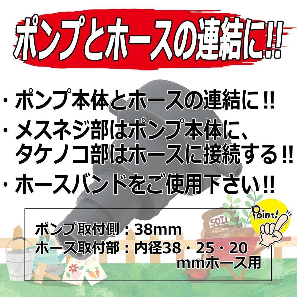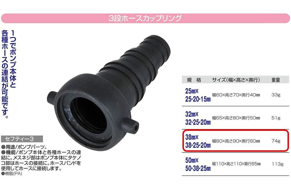 ・38mm口径ポンプを38mm、25mm、20mmのホースへの接続が可能