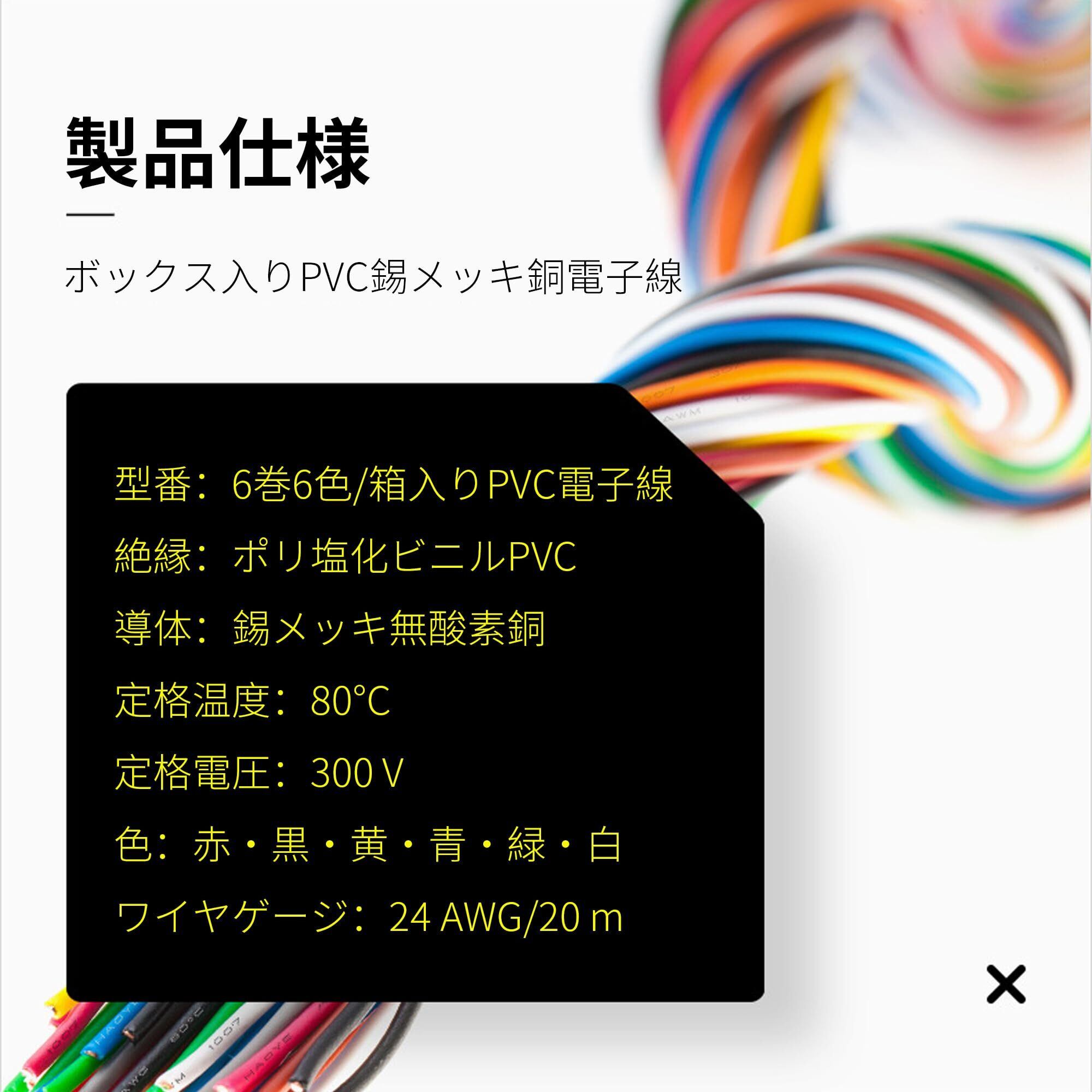 【製品の内容】:24AWG/120m(赤・黒・黄・青・緑・白の6色のライン、各色1巻、各巻20 mを含む)【外径】:1.4mm、断面積:0.13mm²