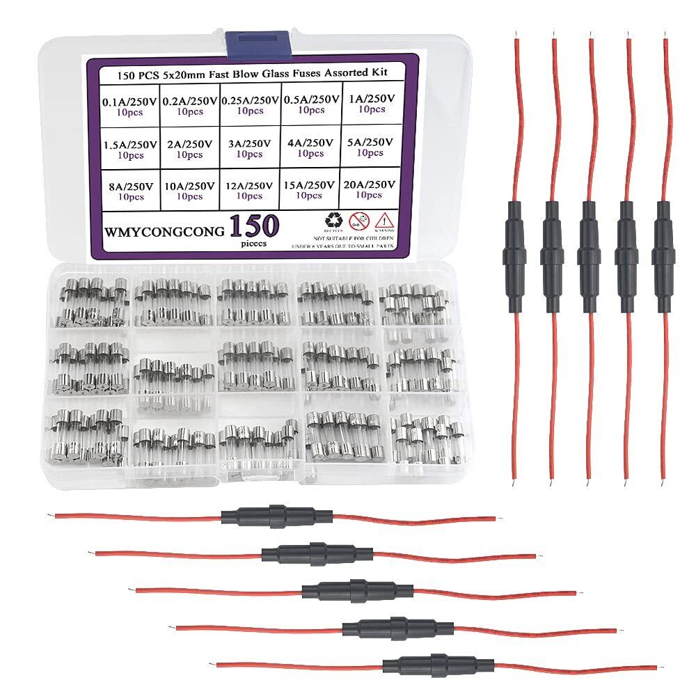 WMYCONGCONG 10個 5x20mmインラインヒューズホルダー + 150個 5x20mm ガラス管 ヒューズ ファストブローガラス管0.1A、0.2A、0.25A、0.5A、1A、1.5A、2A、3A、4A、5A、8A、10A、 12A、15A、20Aキット