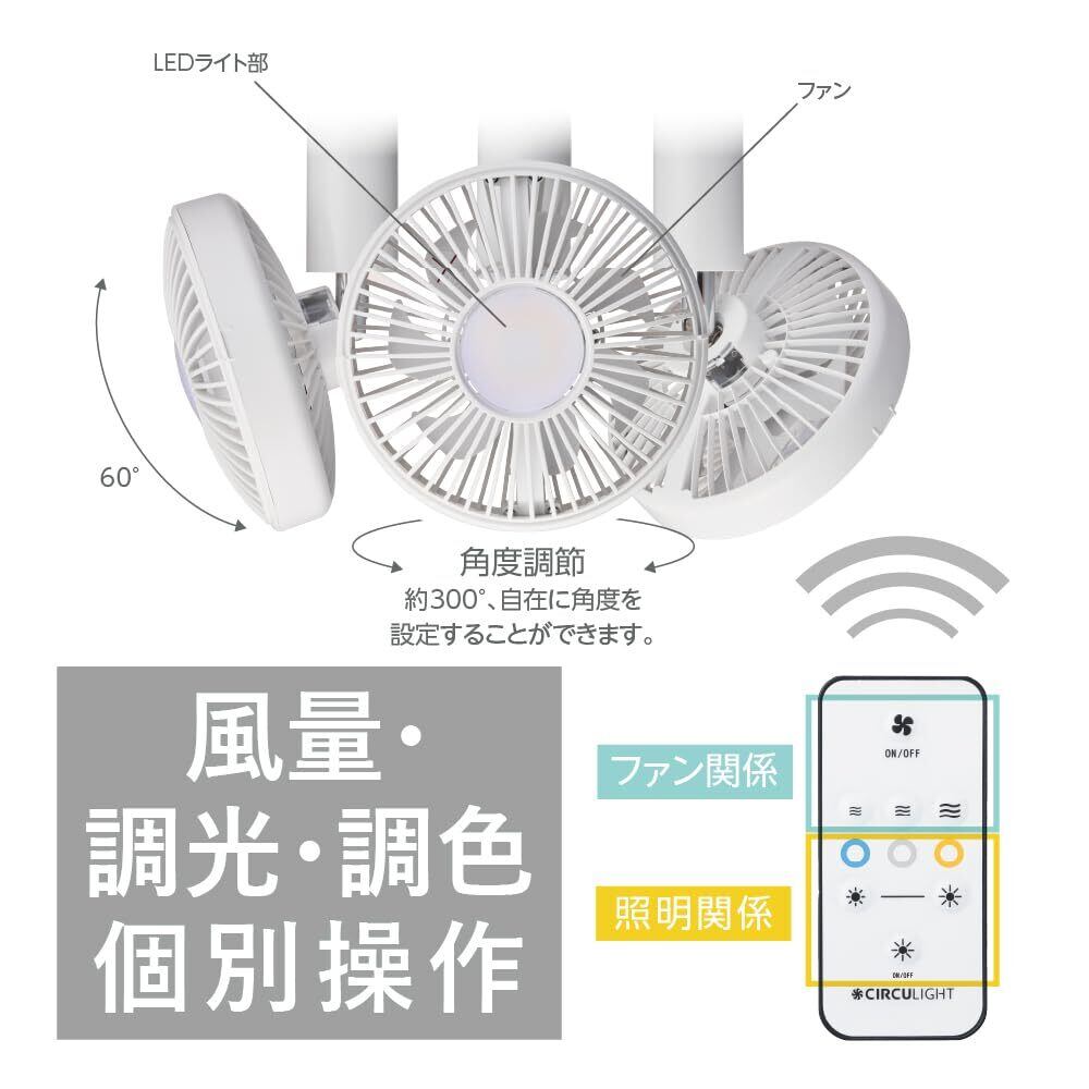 調色3段階・調光2段階。昼光色、昼白色、電球色と3段階に色合いを変える事ができます。お好みの色でお使いください。2段階に光の強さを変えることができます。お好みの明るさでお使いください。照明とファンの向きは、上下方向60度、水平方向300度の範囲で変える事ができます。お好みの方向に合わせてお使いください。