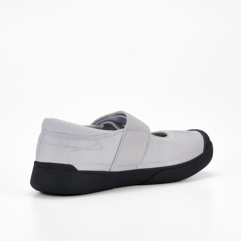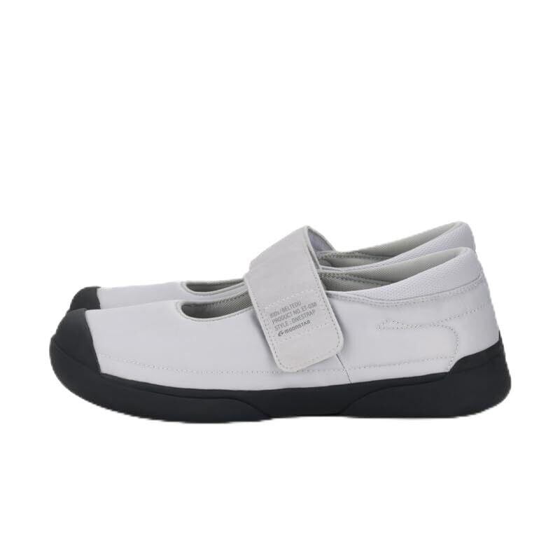「抗菌・防臭」効果のある天然緑茶由来の「カテキン」を中底に搭載。甲調整可能な面ファスナータイプの仕様でバンドが外れても靴が脱げ難く、転倒を防ぐ構造。