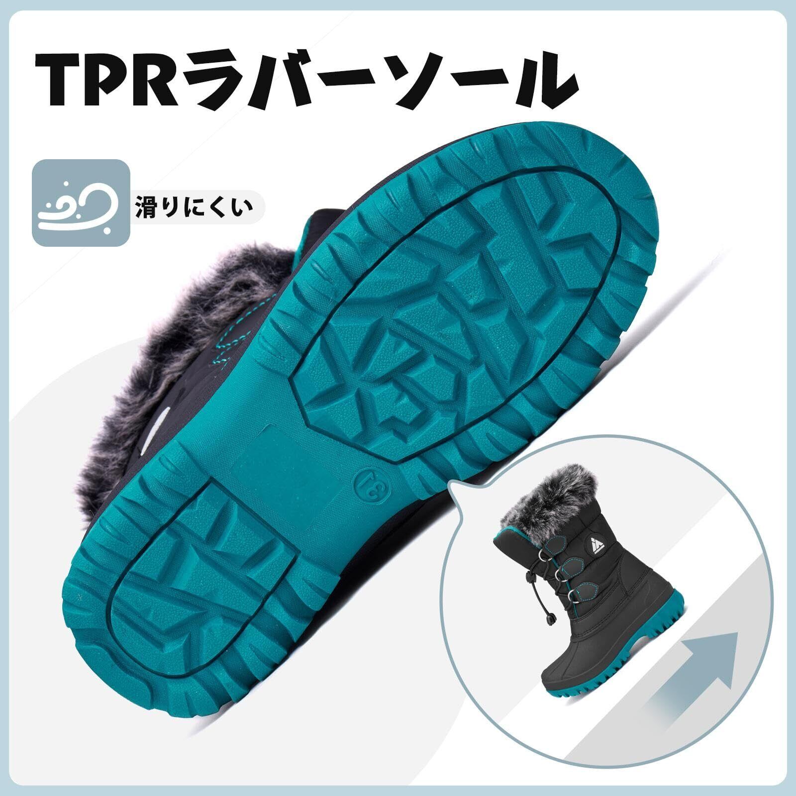 防滑: 耐摩耗性を備えており、滑り防止効果を発揮するゴム製ソールに、活動時に地面をしっかりとつかんでくれるパターンが施されています。厚めのソールが子供をしっかりとサポートしてくれます。とても強力な衝撃吸収性能で両足を保護し、深い雪の中でも自由自在に歩くことができます