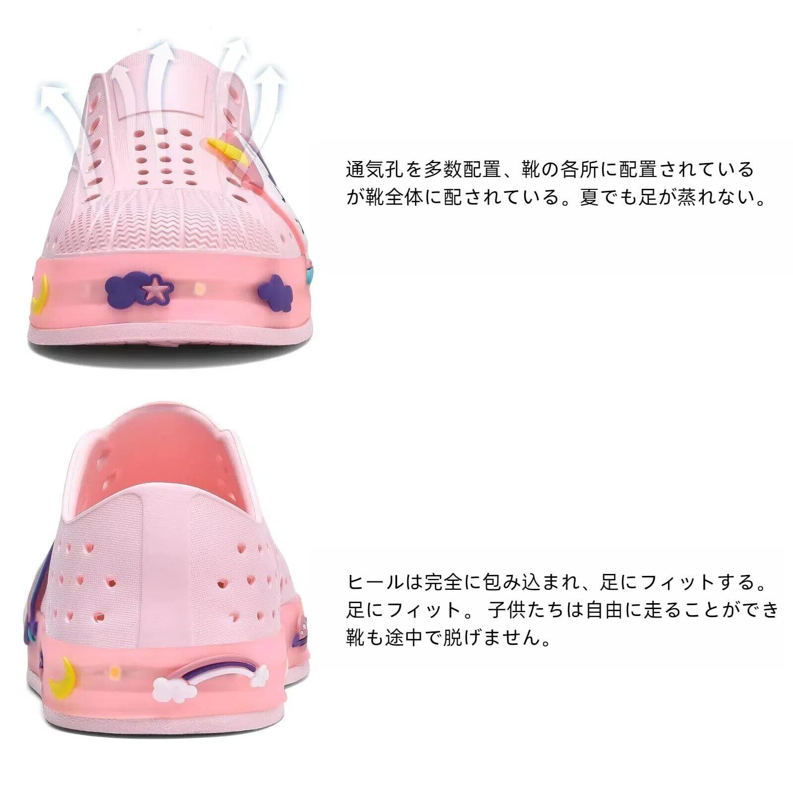 安全で快適なデザイン:このビ サンダル キッズ つま先を保護するクローズドトゥデザインと、通気性のあるエアホールが足を涼しく乾燥させます。速乾機能により水分の蓄積を防ぎ、水遊びに最適です。