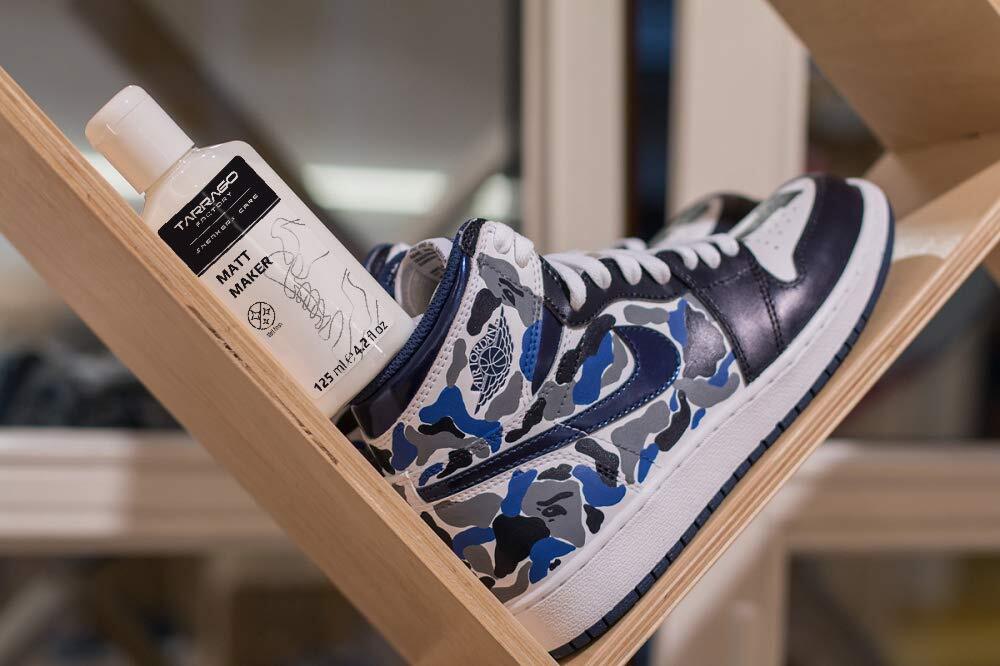 Tarrago(タラゴ)スニーカーペイントは水性の顔料で、スムースレザーや合成皮革、キャンバススニーカーの色補修やカスタマイズが可能です。従来品の弱点であった、水や摩擦による「色落ち」、乾燥、屈曲による「割れ」、「はがれ」への耐久性を高いレベルで実現した商品です