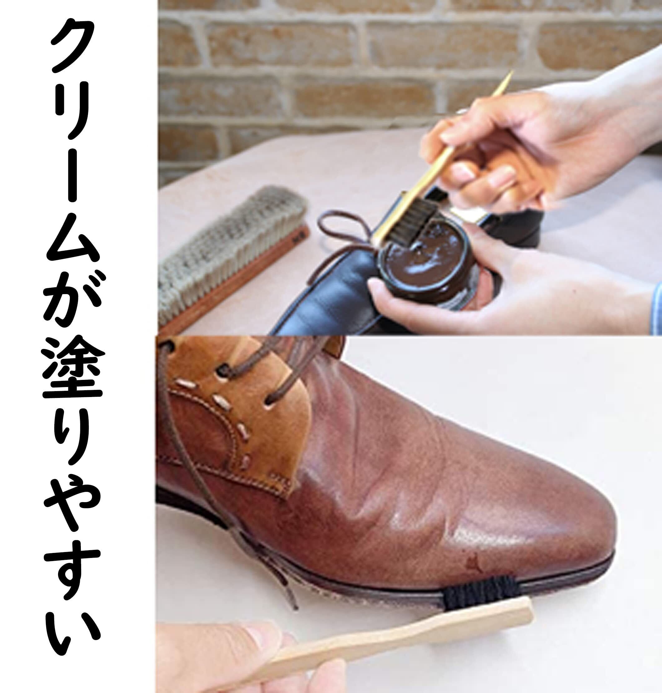 布での塗布 ブラッシングよりブラシの方がクリームを全体的にまんべんなく伸ばしやすい。手を汚さずに効率的に作業ができる。コバの部分やメダリオン、革のシボ(シワ)など布では届かない部分までクリームを塗り、詰らない様にかき出す事ができる。布にクリームを取ると布自身にクリームが吸収されてしまい適量を確実に塗ることができない。