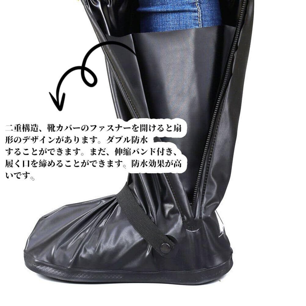 【高い防水性能】防水性に優れたPVC素材を使用し、二重構造、靴カバーのファスナーを開けると扇形のデザインがあります。ダブル防水することができます。まだ、伸縮バンド付き、履く口を締めることができます。防水効果が高いです。
