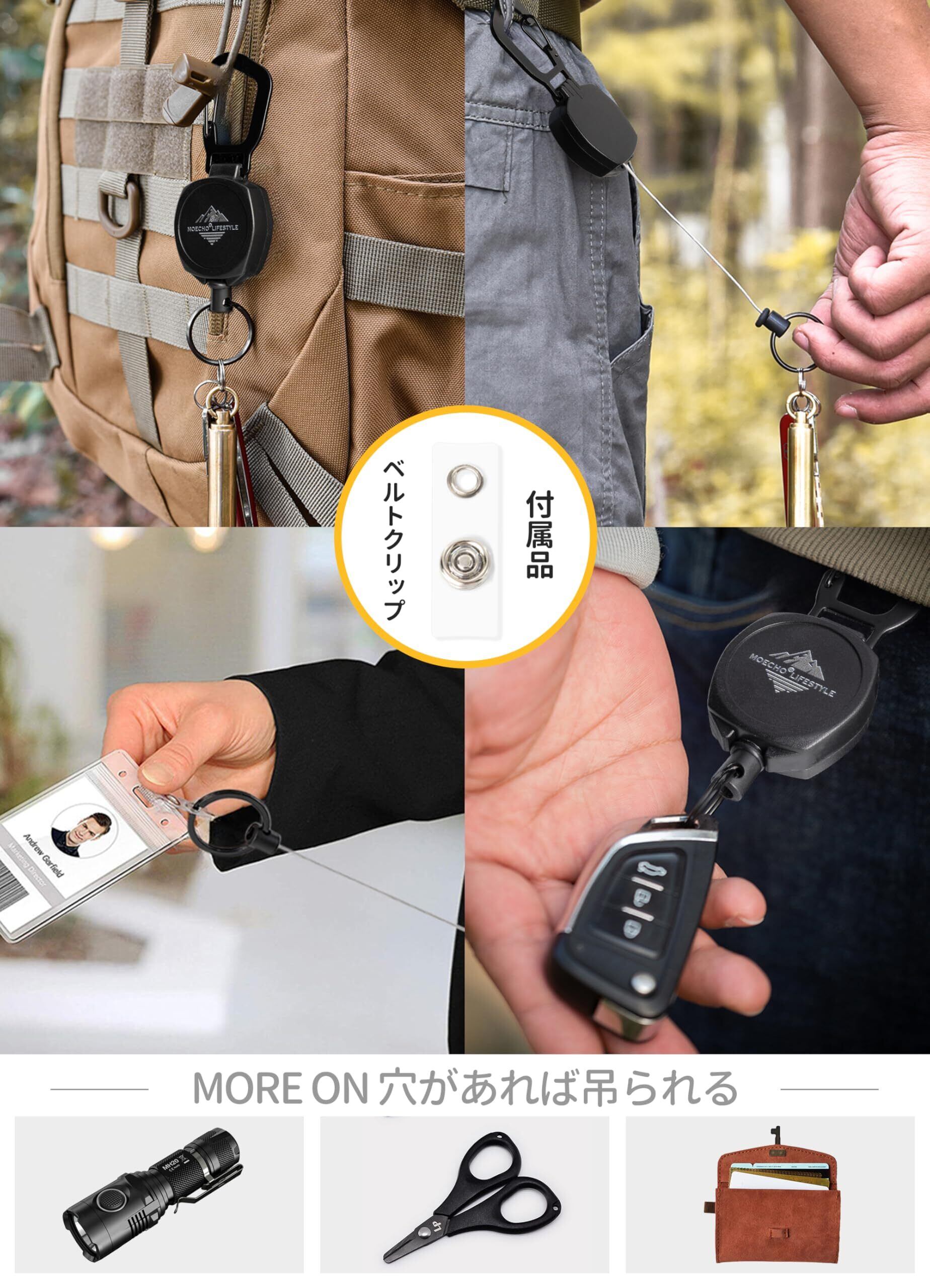 【カラビナ&ベルトクリップ付き・幅広い適用範囲】本製品は、リールキーの伸縮耐荷重が強化するだけでなく、付属のベルトクリップにより、日常生活での使用方法がさらに広がります。登山や釣りなどのアウトドア活動はもちろん、通勤や通学でも便利にお使いいただけます。お客様の生活をさらに便利にする一品です