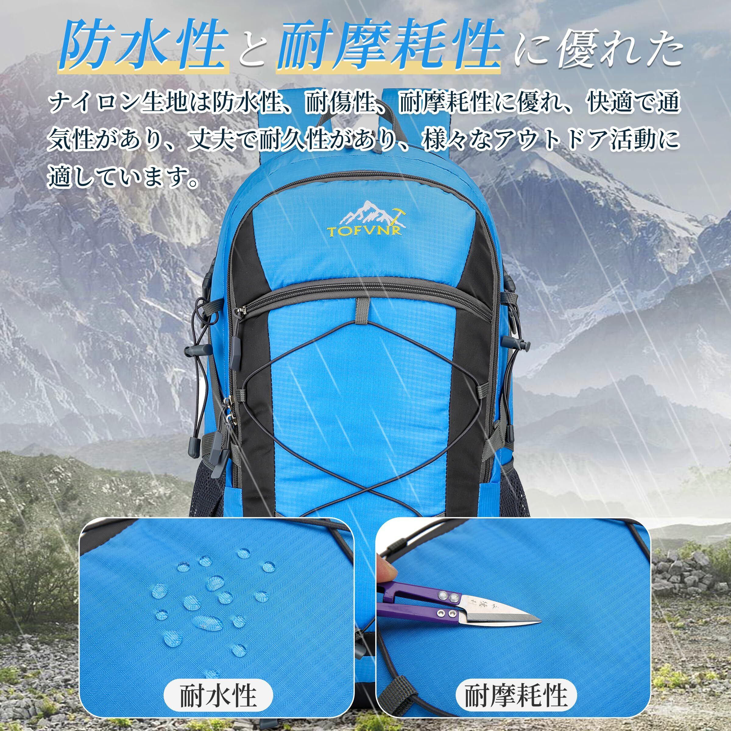 【防水&耐久性】バックパックは防水ナイロン素材で作られており、防水性と汚れに強いです。水をかけても中に浸み込まずに玉になって表面を転がり落ちるので、 突然の雨にも安心です。(注意:登山 リュックは完全防水ではありません、雨が激しく降るとジッパーから水が入る場合があります)、また、バックパックは速乾性があり、洗濯後もすぐに乾くので、使い勝手が良いです。 当社の防水 リュックは、高品質の破れにくい素材、SBSジッパー、高強度ファスナーを採用しており、緩みにくく、壊れにくく。耐久性と耐摩耗性を確保しています。 ストレスポイントが補強されているため、重い物を入れても簡単に壊れず、長持ちする耐久性を提供し、ハイキングやキャンプの冒険に最適です。