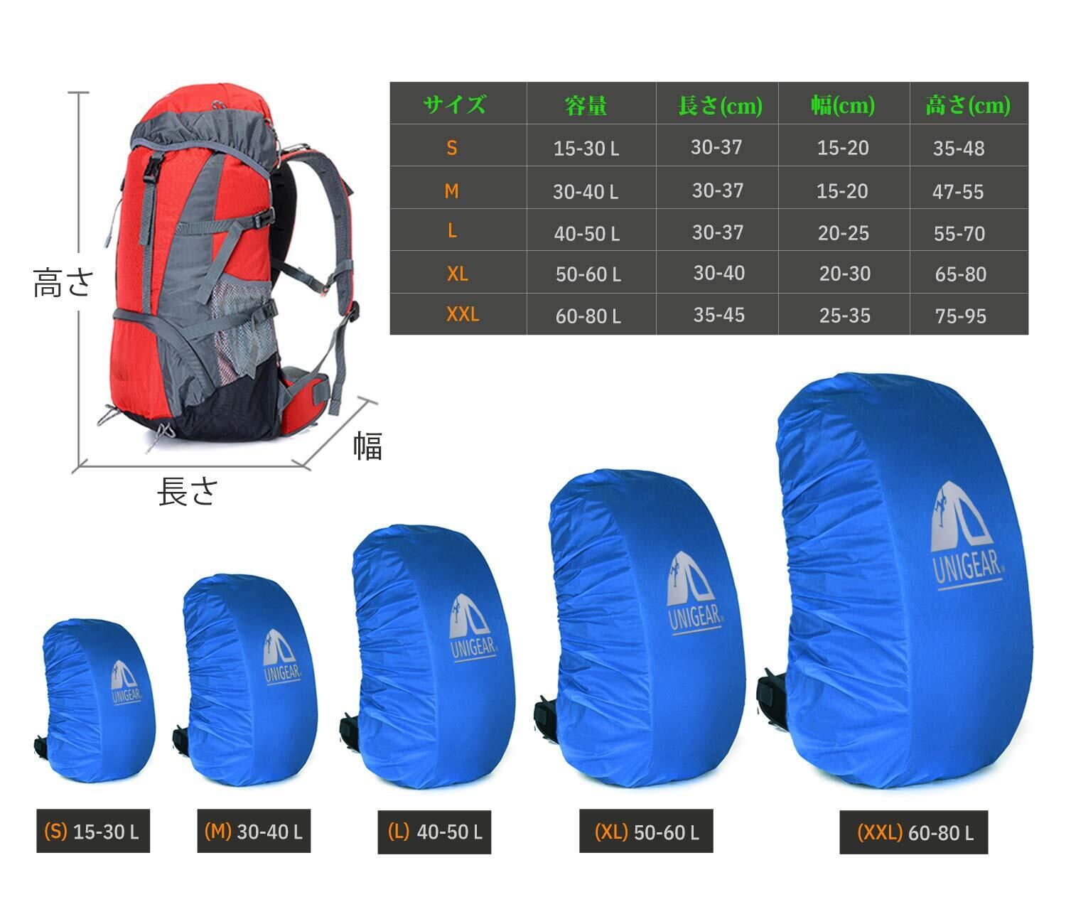 [Unigear] リュックカバー レインカバー 雨よけ ザックカバー 防水カバー 2倍以上の防水 耐水压5000mm 夜間反射 アウトドア 通勤 通学 梅雨対策 収納袋一体化 超軽量 5カラー 5サイズ 15L-80L