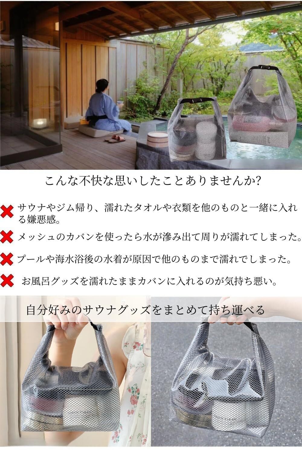 【適用場合】メッシュバッグは、温泉、サウナ、スパ、ジム、銭湯に大活躍!