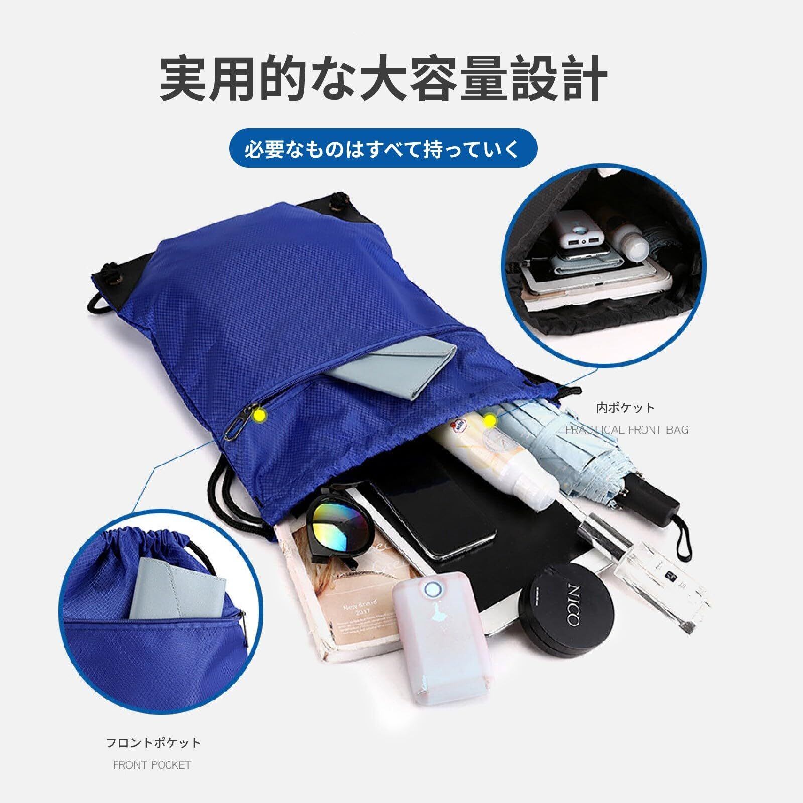 大容量と複数のコンパートメント:このジム用ドローストリングバッグはL:50×43cm / S:44*34cm、ジムウェア、シューズ、タオル、日用品などをたっぷり収納できます。ドローストリングバッグは、ドローストリングで開閉するメインコンパートメントとフロントジッパーポケットを備え、必需品を整理して収納できます。