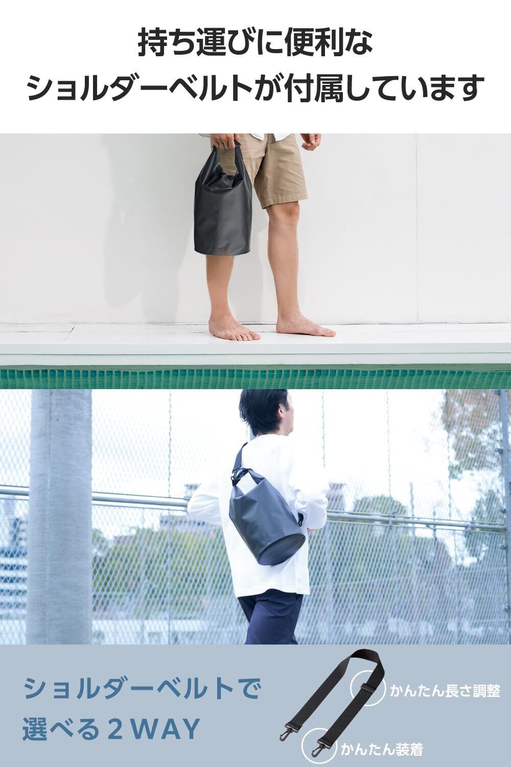 簡単に取り付けることができ、長さ調節可能で持ち運びに便利なショルダーベルトが付いています。