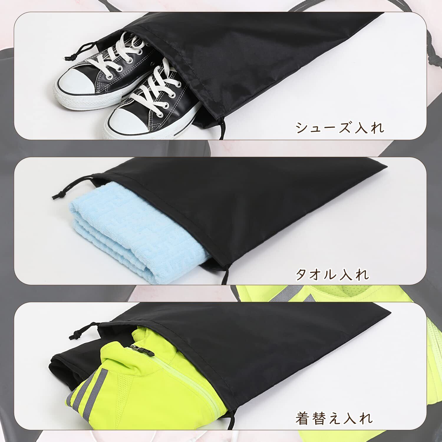 【持ち運びに便利な巾着】:シューズ入れや着替え入れ、バスタオル入れなどとして使える巾着。