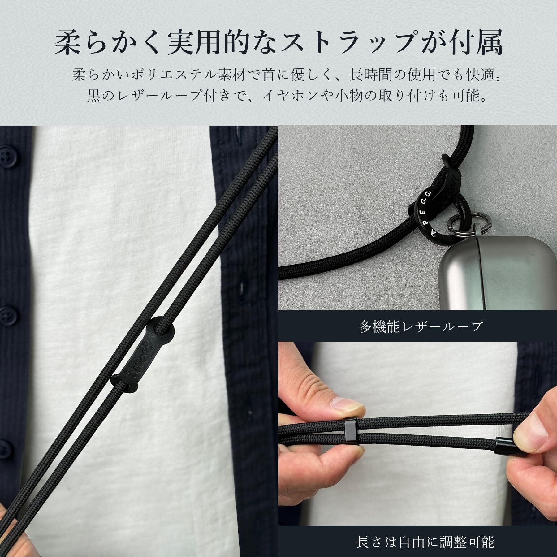調節可能なストラップで首掛け・斜め掛け対応:付属の高品質ブラックストラップは長さ調整可能。シーンに合わせて首にかけたり斜め掛けしたり自由に使い分けでき、両手が空いて快適に移動できます。使わないときは簡単に取り外しも可能。