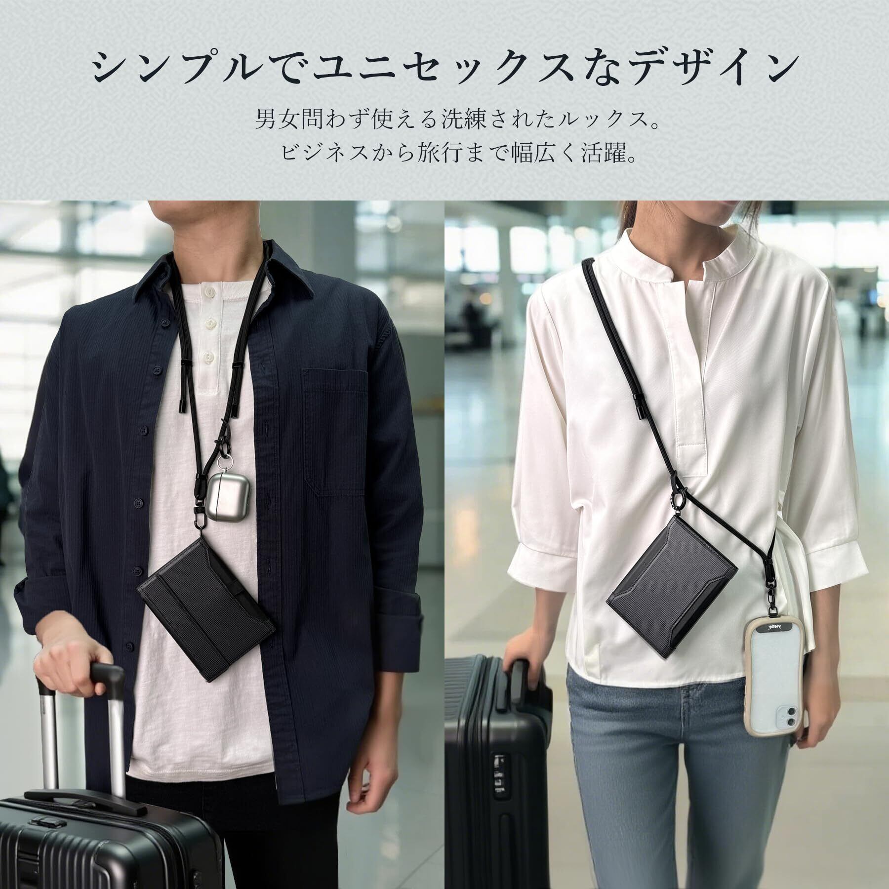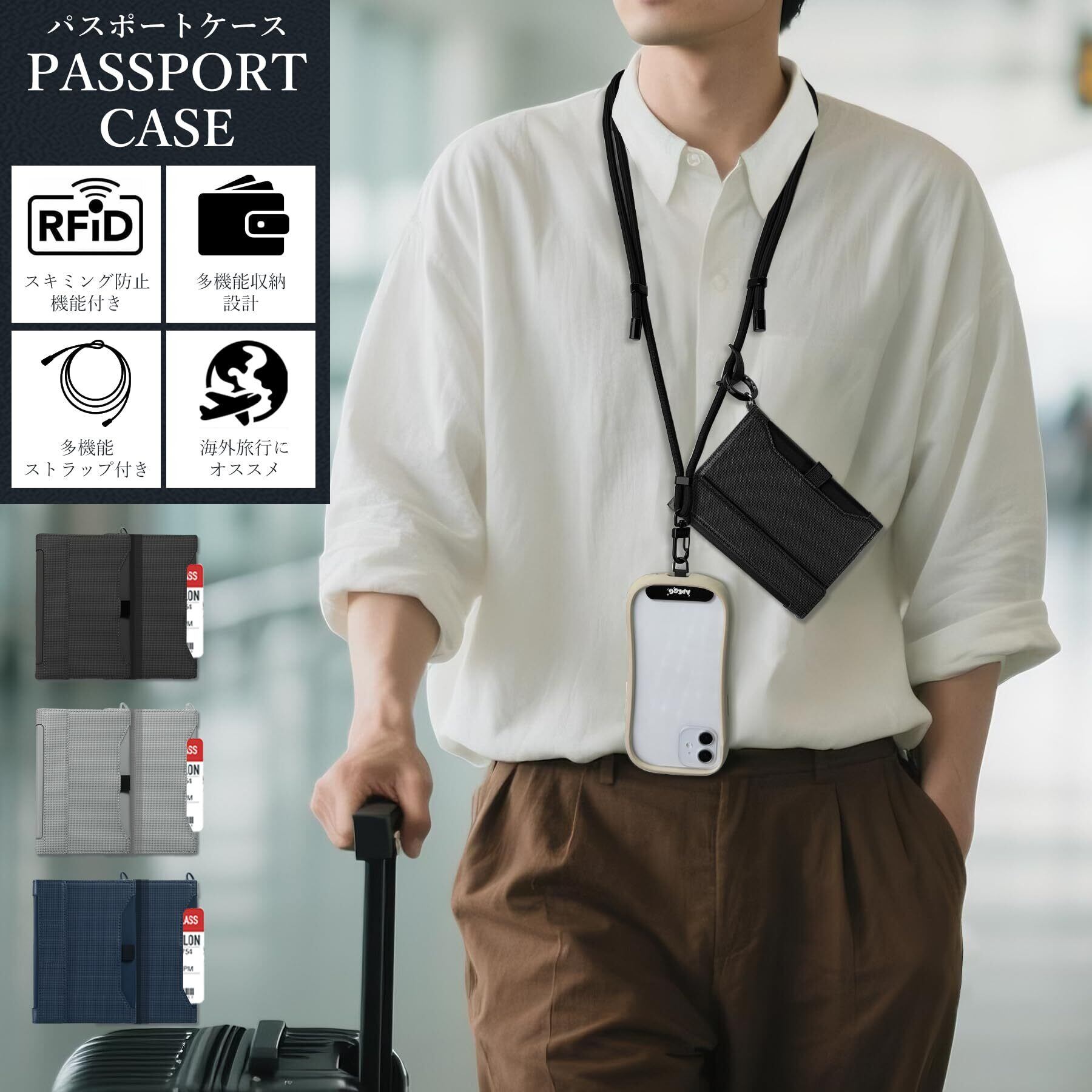 スマホストラップ&パスポートケースの一体型セット:スマホとパスポートケースを一緒に持ち歩ける便利な組み合わせ。付属のブラックストラップは、スマホにもパスポートケースにも取り付け可能。首掛けや斜め掛けで両手が空き、旅先での移動やチェックインもスムーズに。必要なものをまとめて管理でき、旅行や出張で大活躍。