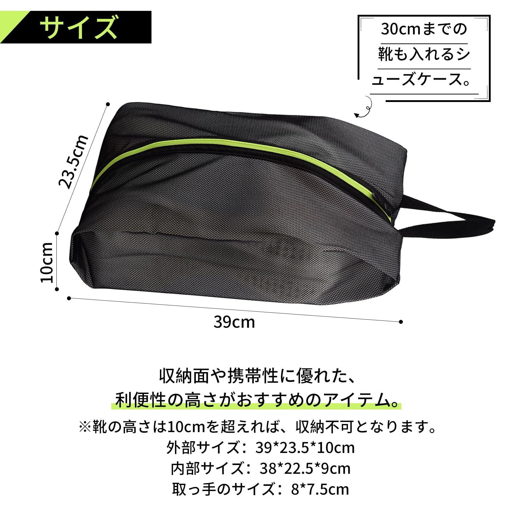 サイズ:シューズケースのサイズ約24x39x9cm。30cmまでの靴もゆったり収納可能です。バスケシューズ、スニーカー、ゴルフシューズ、革靴などの一般的な靴の大きさに合わせるサイズ、出し入れしやすいです。使わない時は、くるくる巻くだけでいつでもバッグに入れておけるサイズ。