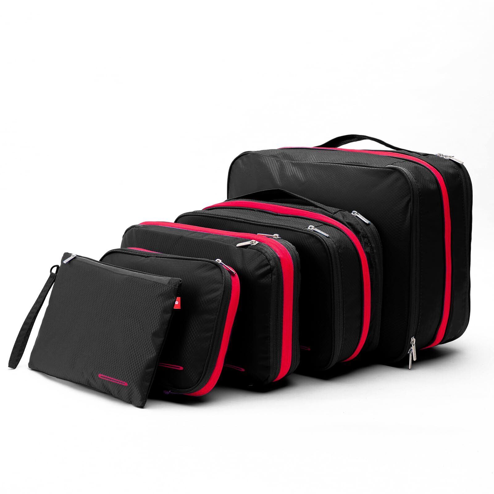 Bee Nesting圧縮バッグ 防水トラベルポーチ 旅行用圧縮袋 衣類圧縮袋収納 ファスナー 拡張可能 ペース節約 2 つの収納コンパートメント 軽量 出張 旅行 便利グッズ 5点セット(4L/9L/15L/26L/Liteブラック・レッド)