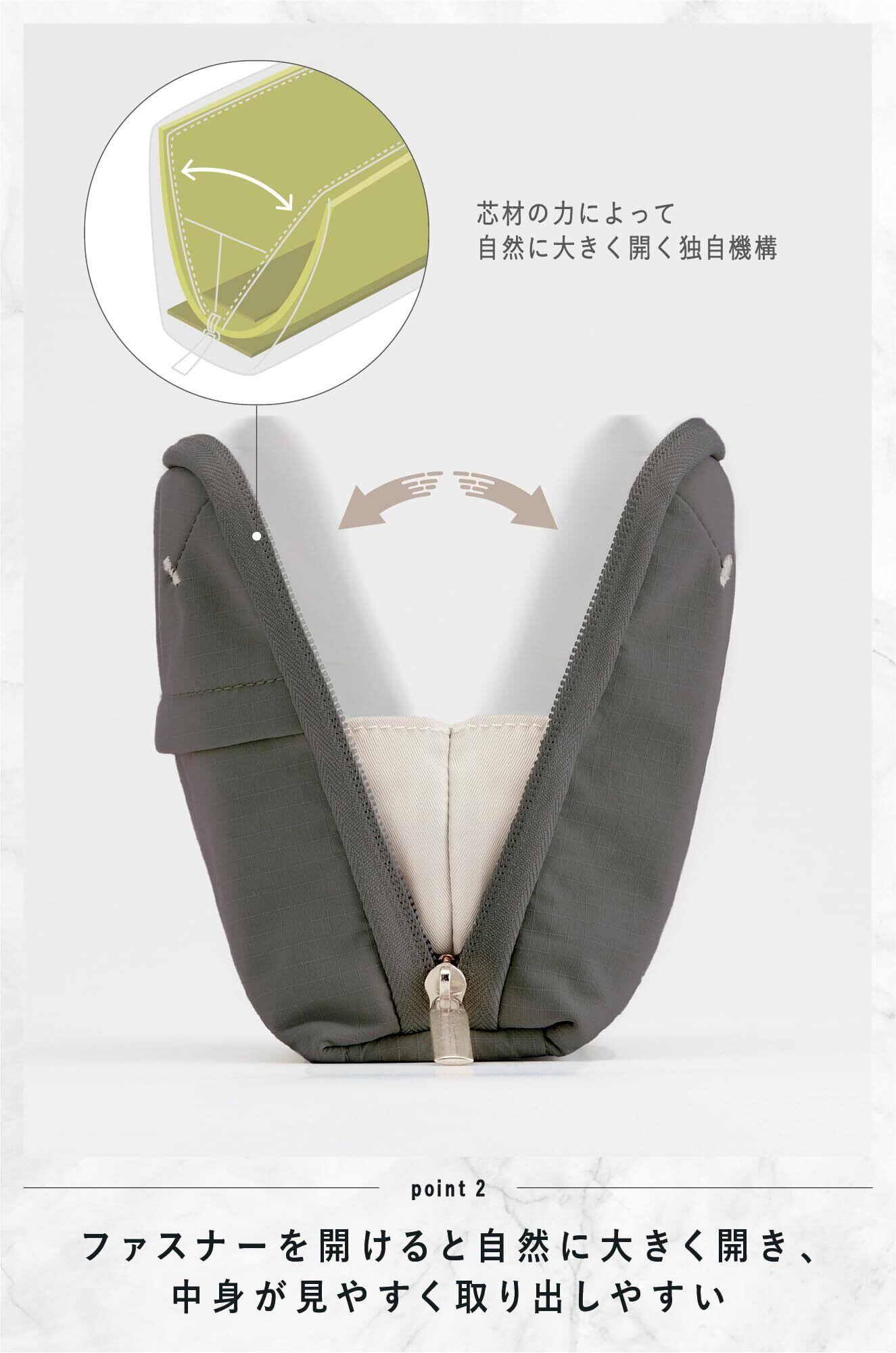 【POINT2:ファスナーを開けると自然に大きく開き、中身が見やすく取り出しやすい】 独自開発の芯材構造により、ファスナーを開けると自然に大きく開いて中身が見やすい。また、開いた状態をキープするので片手でも出し入れしやすい。