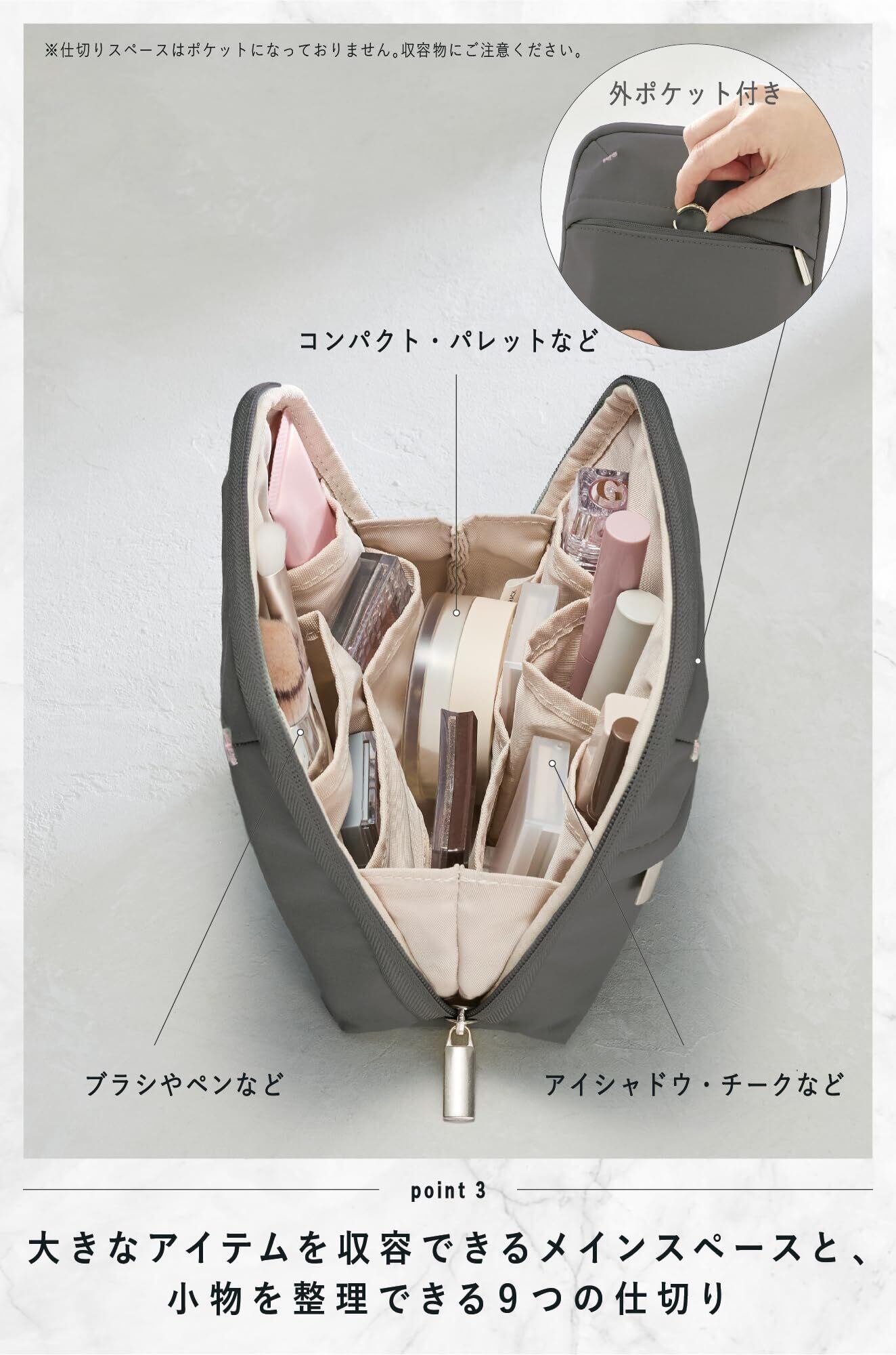 【POINT3:大きなアイテムを収容できるメインスペースと、小物を整理できる9つの仕切り】 ファンデーションなど大きめのアイテムが入るメインスペースに、ブラシやマスカラなどを分けて整理できる9つの仕切り、外側にはちょっとした小物を入れられるファスナーポケット付き。 ※仕切りスペースはポケットになっておりません。収容物にご注意ください。