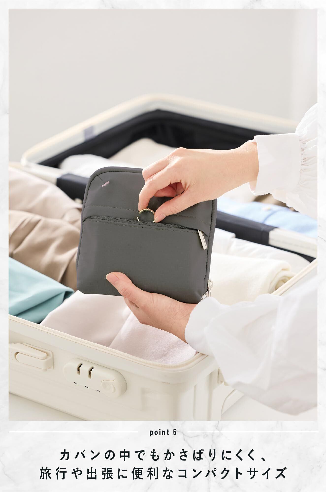 【POINT1:自然にパッと開いて自立するコンパクトなトラベルポーチ】 自然に大きく開くので一覧性が良く、コンパクトに自立するので狭い場所にもぴったり。