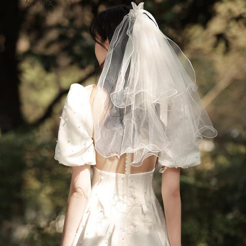 [CHENLONB] ベール ウェディングベール 花嫁ベール 可愛い パール 蝶結び付き波打つ縁 ウエディングドレスの飾り用品 写真 舞台劇 2層ウエディングベール 約60-80cm