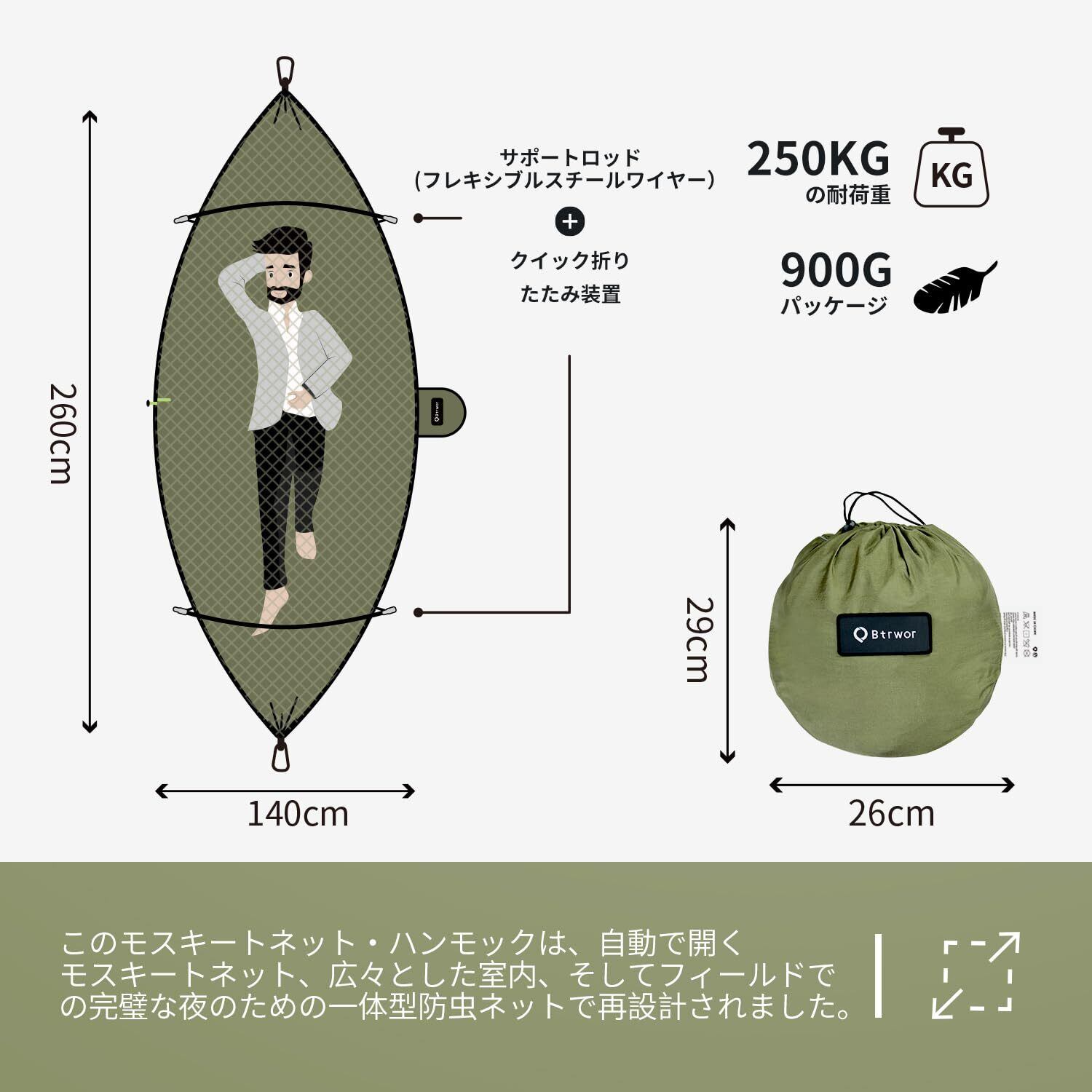 BTRWOR ハンモック モスキートネット付き 軽量 ポータブル ナイロン 260×140cm 耐荷重 300kg 自動蚊帳設定 キャンプ、インドア、アウトドアに適しています (アーミーグリーン)