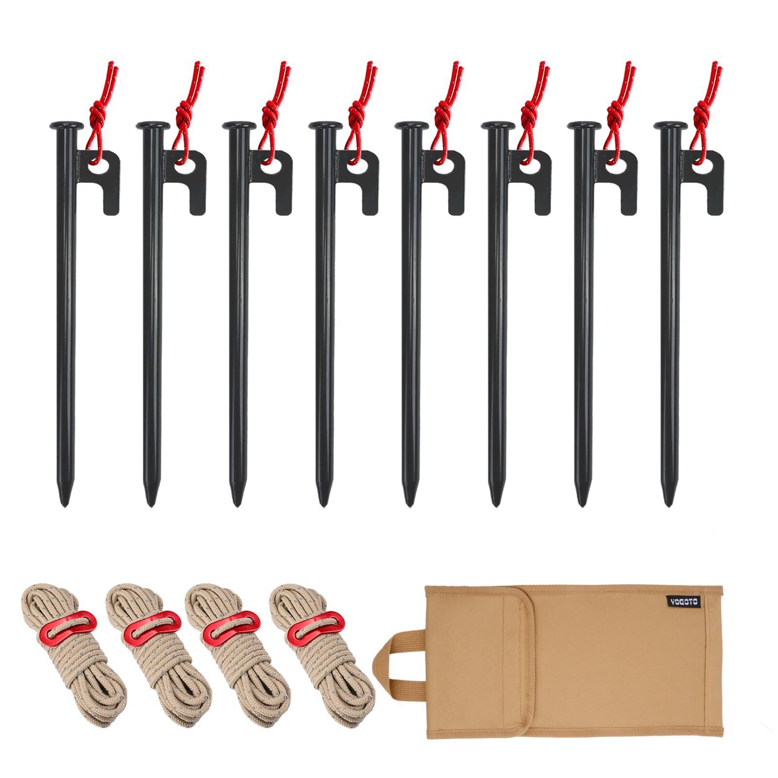 YOGOTO スチールペグ 20cm セット キャンプペグ テント用ペグ ペグケース付き タープペグ 硬い土 砂地 草地用 φ10mm 1年間品質 自在金具付き (20cm8本+テントロープ4本+収納ケース)