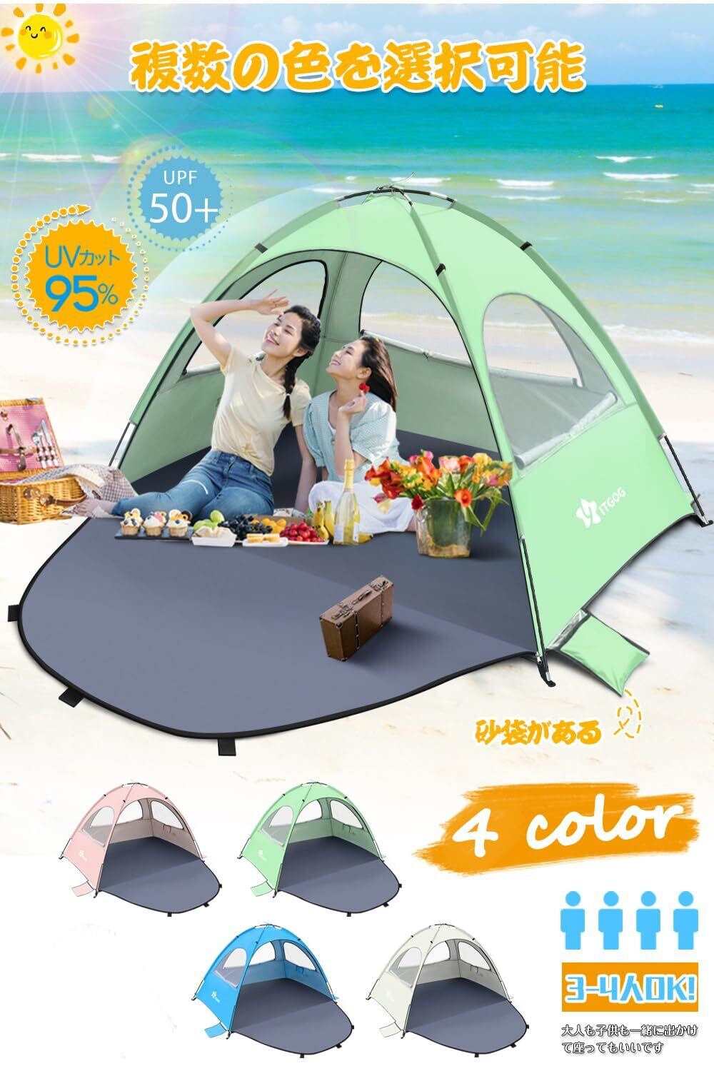 YITGOG ビーチテント サンシェードテント 3-4人用【紫外線防止/通気性高い】 レジャー用 折りたたみ 軽量 3つメッシュ窓 フロントシート付き 5色 キャンプ 海 花見 収納袋と日本語説明書付き