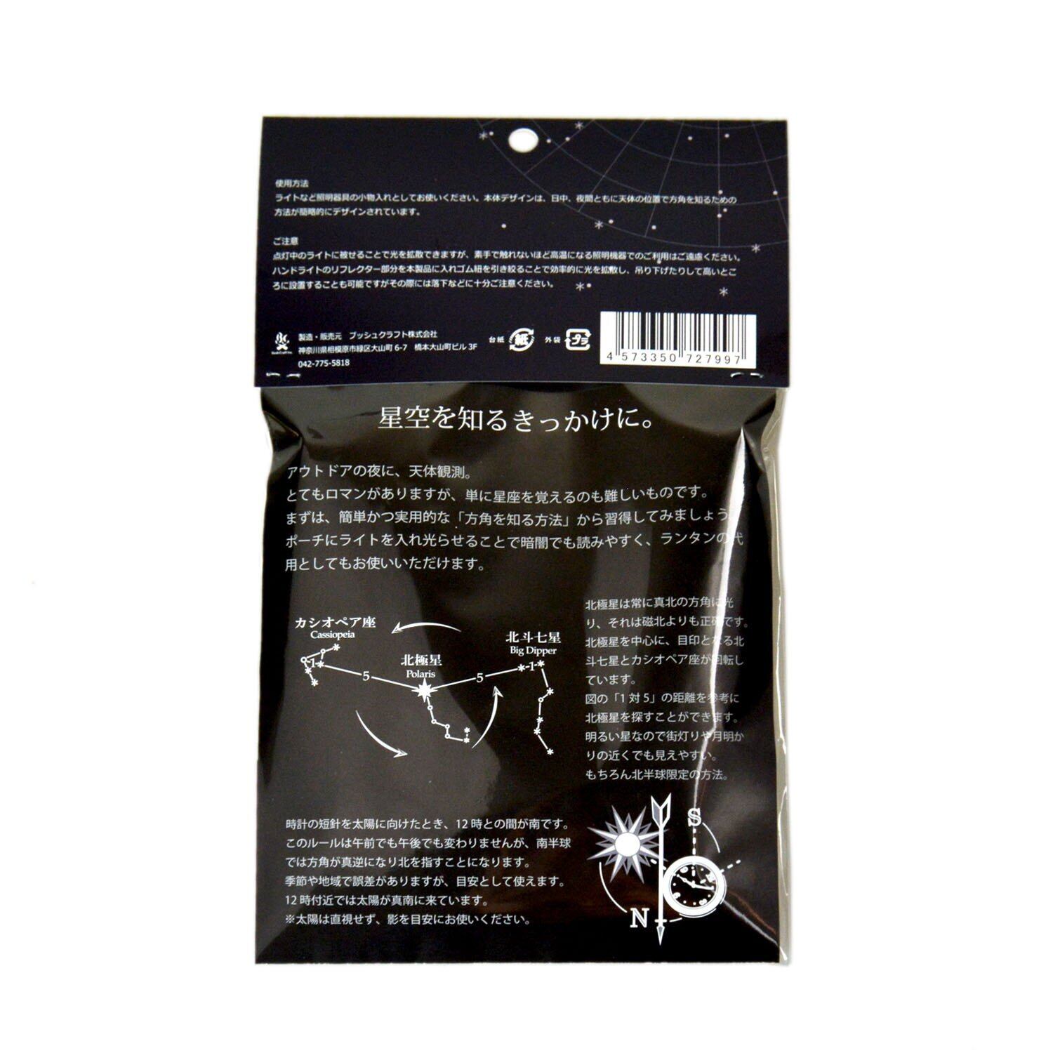 本体デザインは、日中、夜間ともに天体の位置で方角を知るための方法が簡略的にデザインされています。