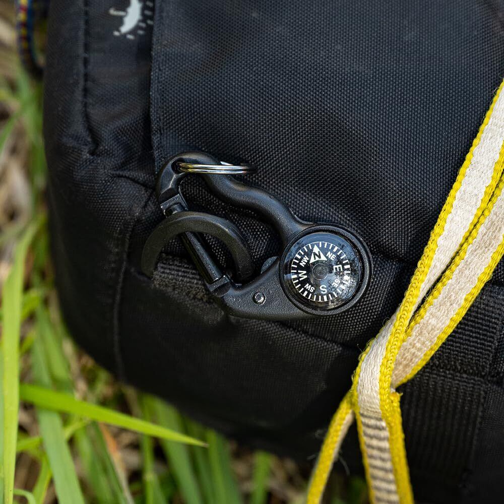 手軽なカラビナクリップ - アルミニウム製のカラビナでMagniCompをお手持ちのパーカー、ジャケット、かばんのジッパーに取り付けられます。キャンプ、ハイキング、徒歩旅行、サバイバルギアに最適なアクセサリ。