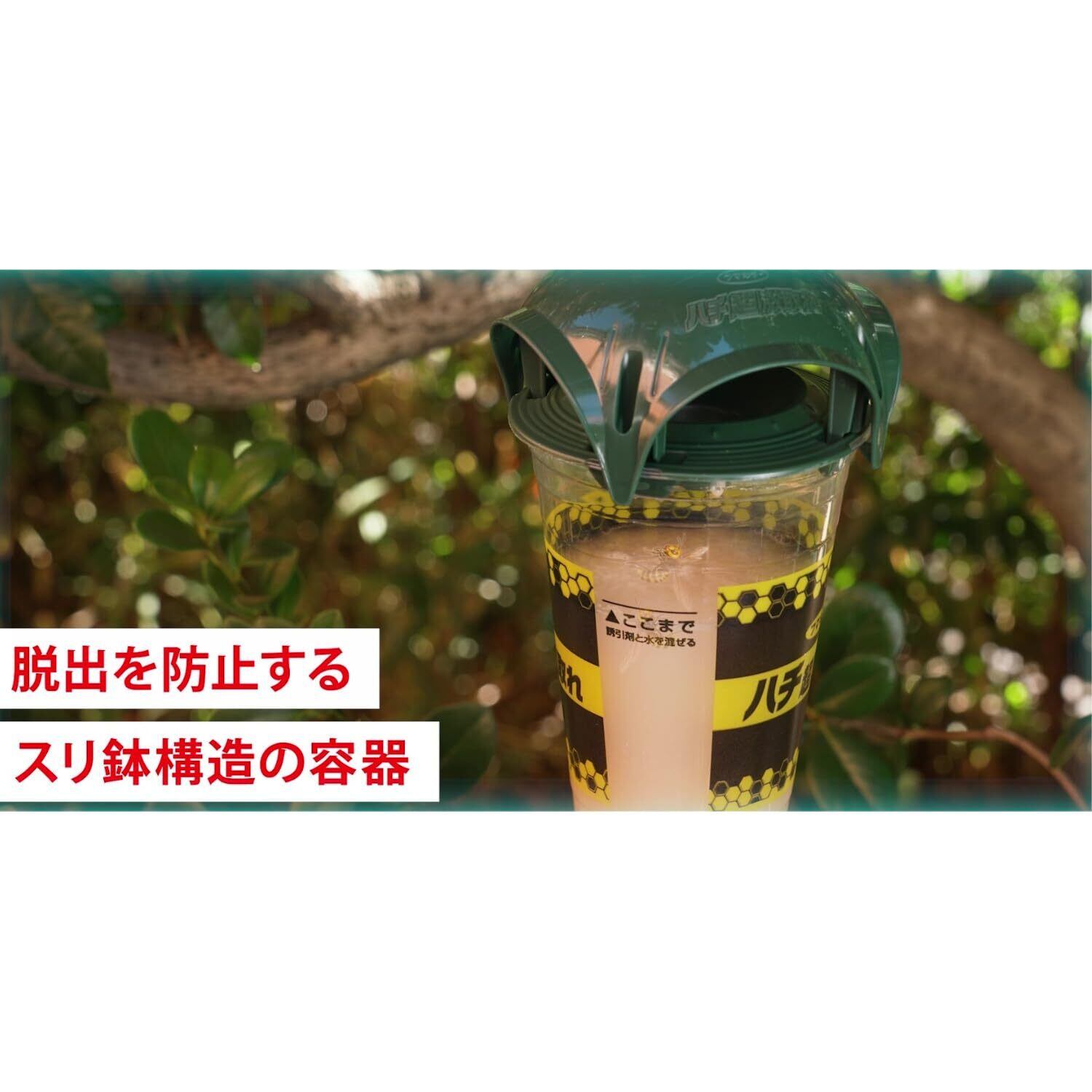 ●吊るした日から強力誘引 人工樹液に乾燥酵母を加えた独自ブレンドの誘引捕獲液でハチを強力に誘引します。 ●一度入ったら出られない 容器に落下したハチに誘引捕獲液が密着し、溺れさせて捕獲。一度入ったら出にくいスリ鉢構造の容器で逃がしません。 ●巣作り予防にも 春先に活動する女王バチを捕獲すれば、巣作りも防げます。 ●持続期間約1ヵ月 ●スズメバチを逃がさない ●容器形状を一新 新形状の屋根の採用により、組み立てが簡単になりました。さらにプラスチック使用量は約20%削減※、環境にも配慮しています。 ※当社従来品比 ●使い捨てタイプ