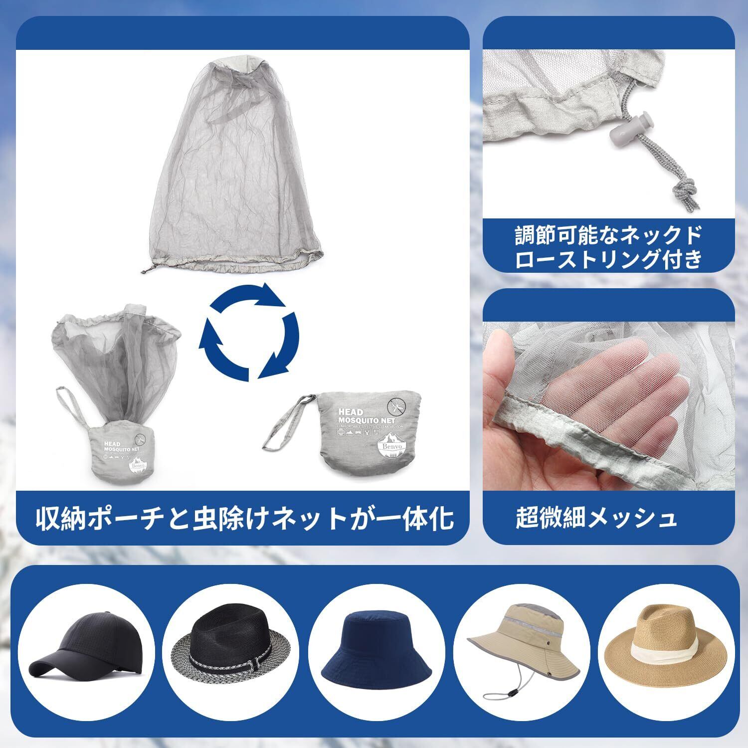 虫除けネットで快適なアウトドアを:防虫仕様のヘッドネットが顔・首・耳を完全保護して、ハイキングや釣り、散歩中でも虫の侵入をシャットアウト!快適なアウトドア体験を最後までお楽しみいただけます。