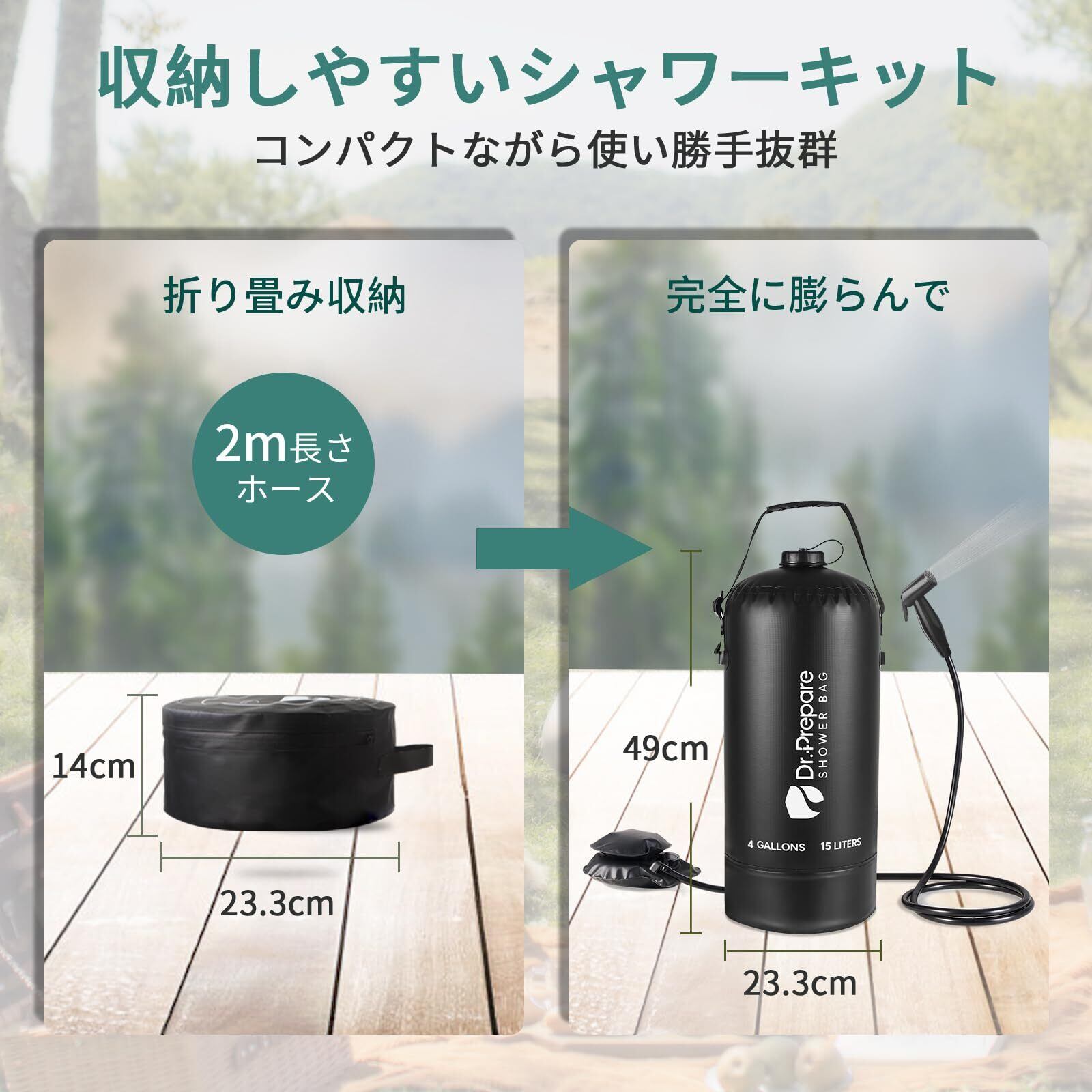 DR.PREPAREポータブルシャワー 簡易シャワー アウトドア シャワー 手動 加圧式 キャンプ 海 ポンプ ソーラー加熱 防災 15Lタンク ブラック