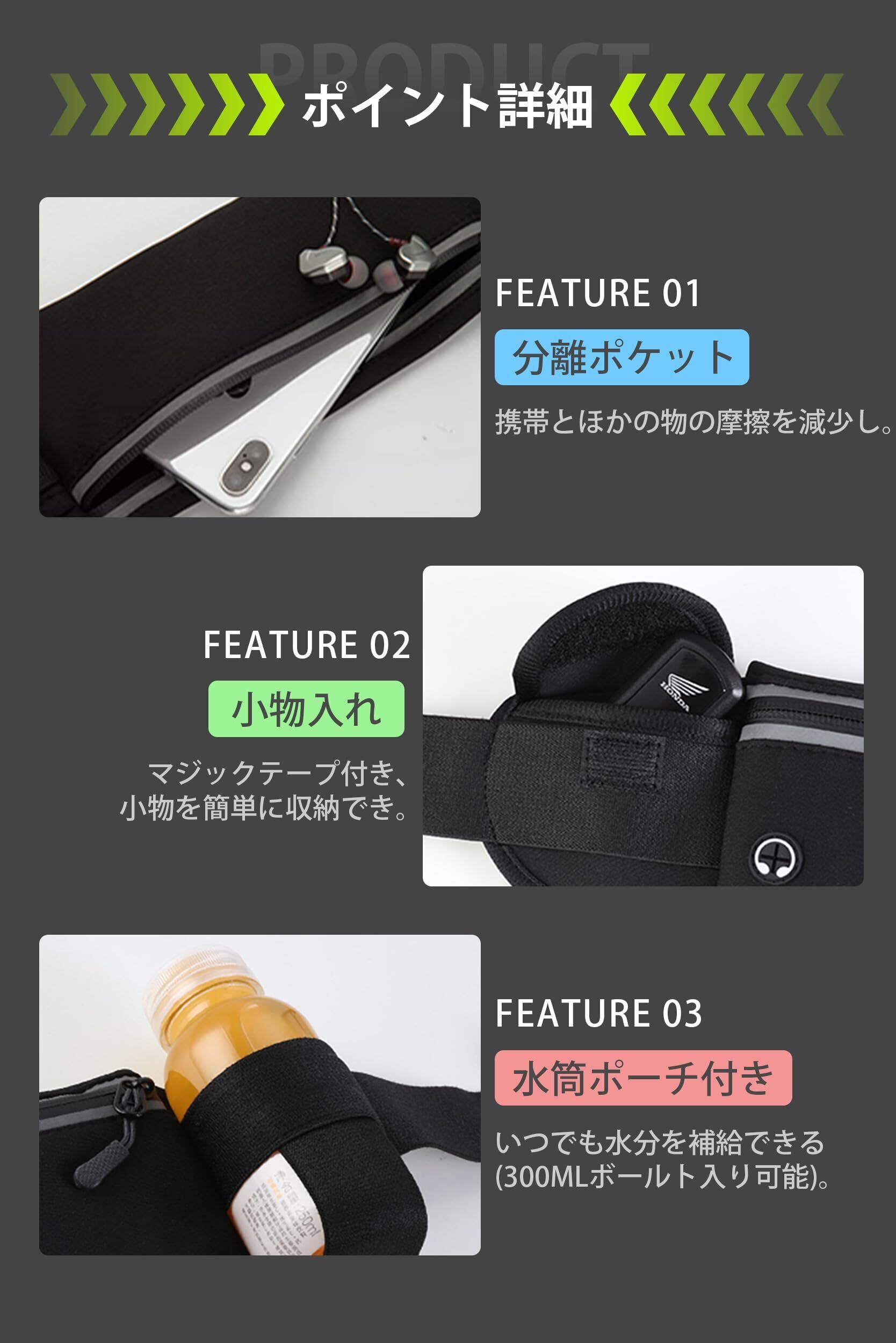 【おススメ・ポイント】 ①防水性の高い素材を利用してるため、汗をかく真夏や、急な雨でも荷物を守れます。②反射デザインがついているため、夜間のランニングポーチでも安心です。③シンプルでかっこいいデザインなので、どんな服にも合わせやすく、サイクリング、ウォーキング、登山、フェスなどにも使えます。